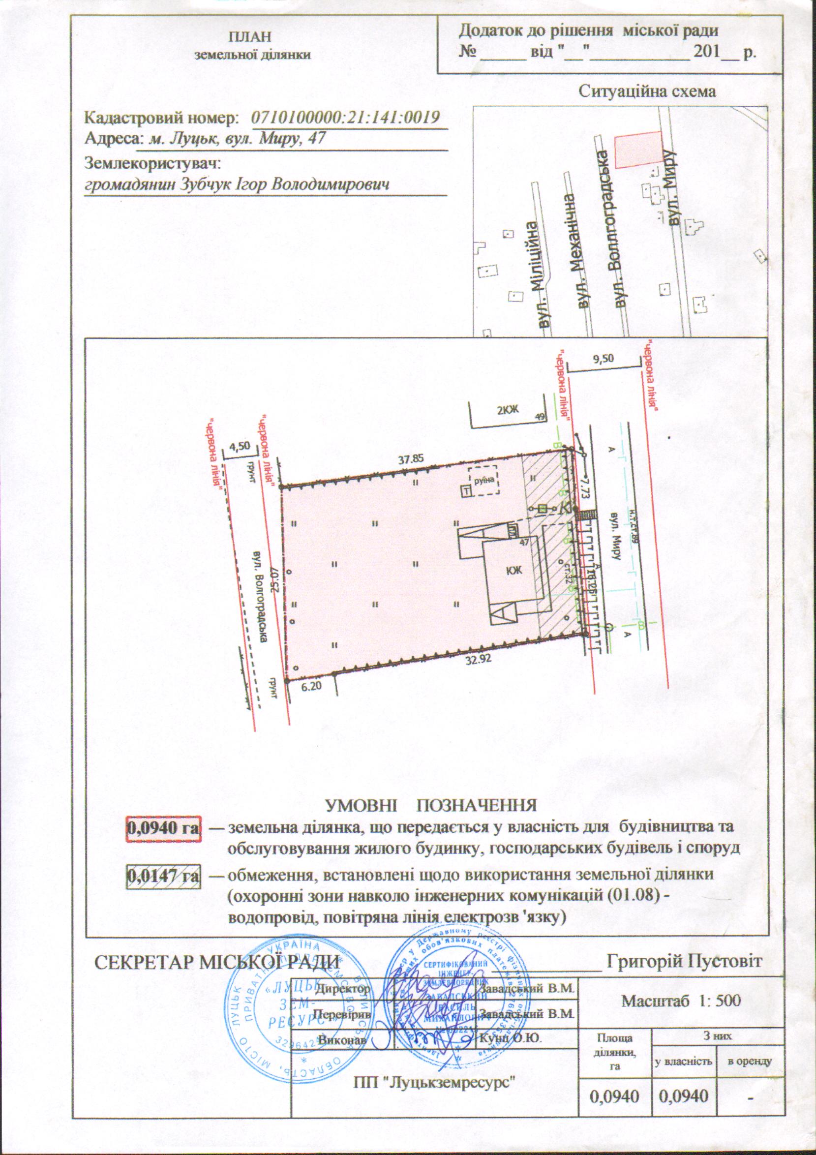 2. Передати громадянину Зубчуку Ігорю Володимировичу безоплатно у власність земельну ділянку на вул. Миру, 47 площею 0,0940 га, кадастровим номером 0710100000:21:141:0019 для будівництва та обслуговування жилого будинку, господарських будівель і споруд, згідно з додатком.