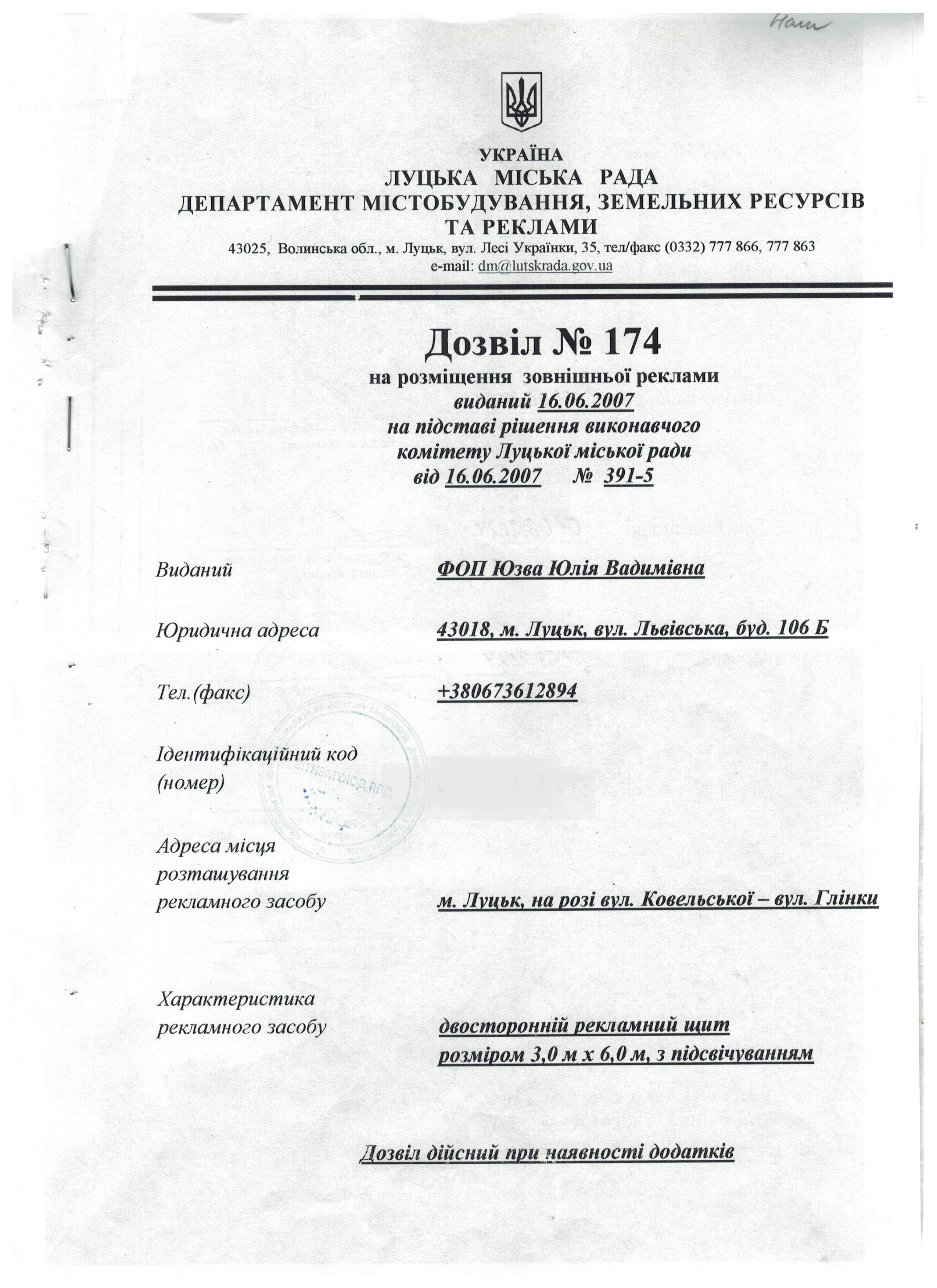 Дозвіл на розміщення зовнішньої реклами № 174 від 16.06.2007, виданий ФОП Юзві Юлії Вадимівні на розі вул.Ковельської та вул. Глінки