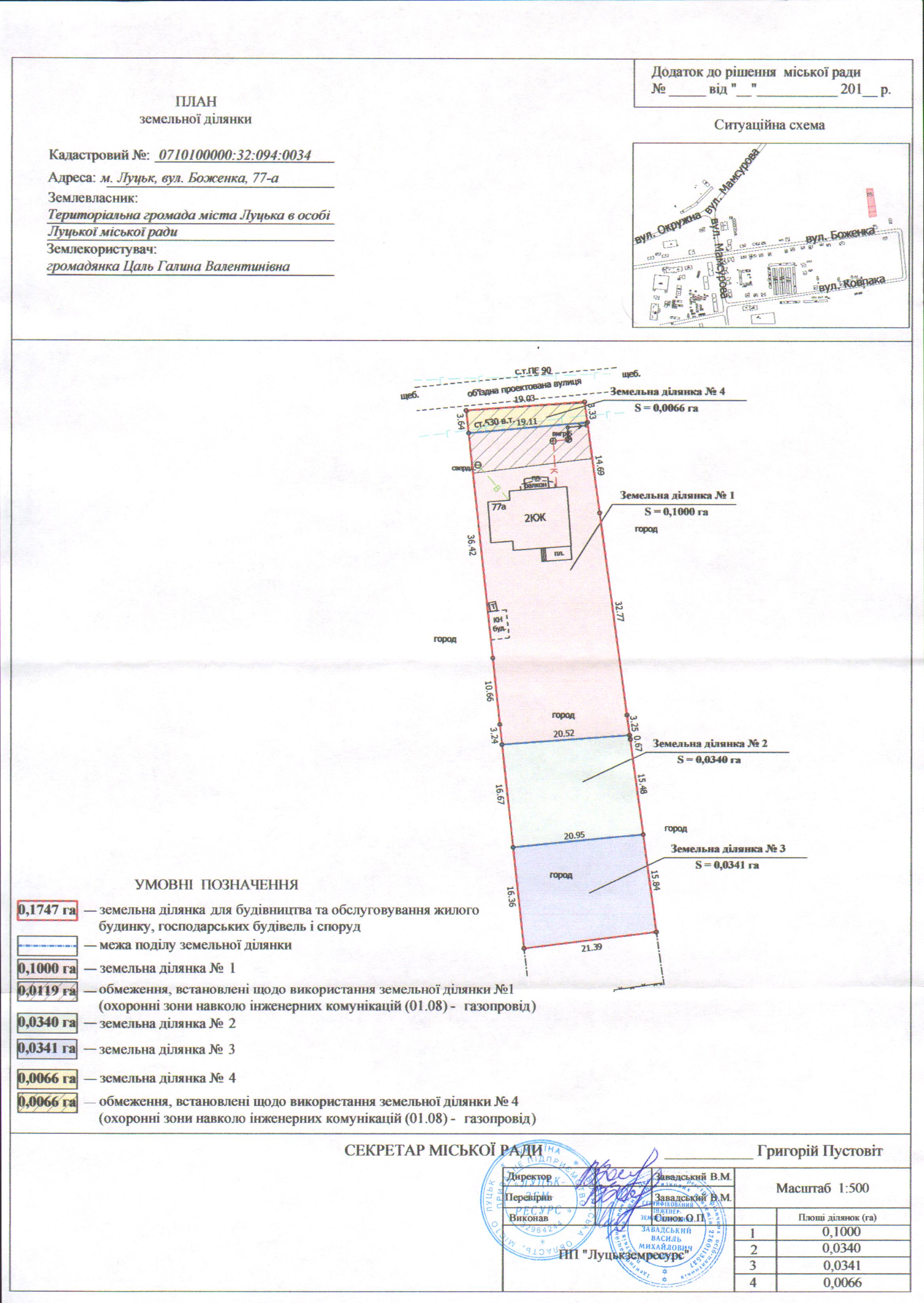 Розглянувши клопотання громадянки Цаль Галини Валентинівни щодо поділу земельної ділянки комунальної власності на вул. Боженка, 77-а, яка перебувала у користуванні для будівництва та обслуговування жилого будинку, господарських будівель і споруд, договір оренди землі, укладений між Луцькою міською радою та громадянкою Крупінською Світланою Миколаївною, зареєстрований у Державному реєстрі земель від 10.07.2012 за № 071010004000624 (право оренди земельної ділянки зареєстроване в Державному реєстрі речових прав на нерухоме майно від 22.06.2017, номер запису про інше речове право: 21124361), строк дії якого закінчився, акт приймання-передачі земельної ділянки, відповідно до якого зареєстроване припинення права оренди на земельну ділянку у Державному реєстрі речових прав на нерухоме майно 17.07.2017, технічну документацію із землеустрою щодо поділу та об’єднання земельних ділянок на вул. Боженка, 77-а, витяг з Державного земельного кадастру про земельну ділянку від 26.04.2017 № НВ-0702948512017, враховуючи правовстановлюючі документи громадянки Цаль Галини Валентинівни на об’єкти нерухомого майна на вул. Боженка, 77-а: договір дарування від 19.02.2015 за № 142, відповідно до якого право власності на житловий будинок зареєстроване в Державному реєстрі речових прав на нерухоме майно 19.02.2015, номер запису про право власності: 8793680; технічний паспорт на об’єкт нерухомого майна на вул. Боженка, 77а від 14.03.2017, витяг з протоколу пленарного засідання тридцять дев’ятої сесії міської ради сьомого скликання від 28.03.2018, керуючись статтями 12, 79-1, 186 Земельного кодексу України, статтею 56 Закону України «Про землеустрій», статтею 27 Закону України «Про Державний земельний кадастр», Законом України «Про внесення змін до деяких законодавчих актів України щодо розмежування земель державної та комунальної власності», статтею 26 Закону України «Про місцеве самоврядування в Україні», Законом України «Про державну реєстрацію речових прав на нерухоме майно та їх обтяжень», пунктами 135-136 Постанови Кабінету Міністрів України від 17.10.2012 № 1051 «Про затвердження Порядку ведення Державного земельного кадастру», міська рада