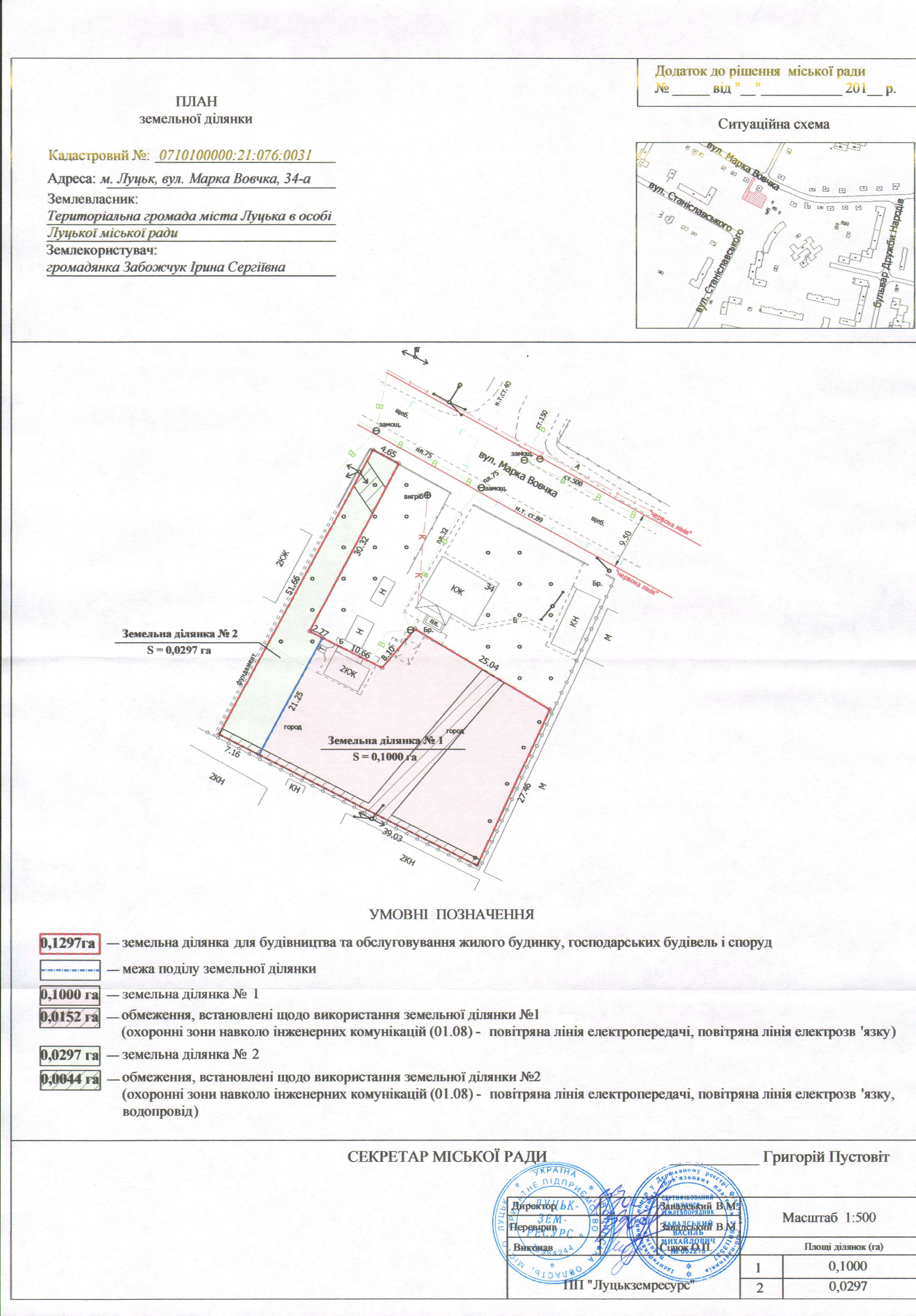 Про поділ земельної ділянки комунальної власності на вул. Марка Вовчка, 34-а (загальна площа 0,1297 га: земельна ділянка № 1 - площею 0,1000 га, земельна ділянка № 2 - площею 0,0297 га).