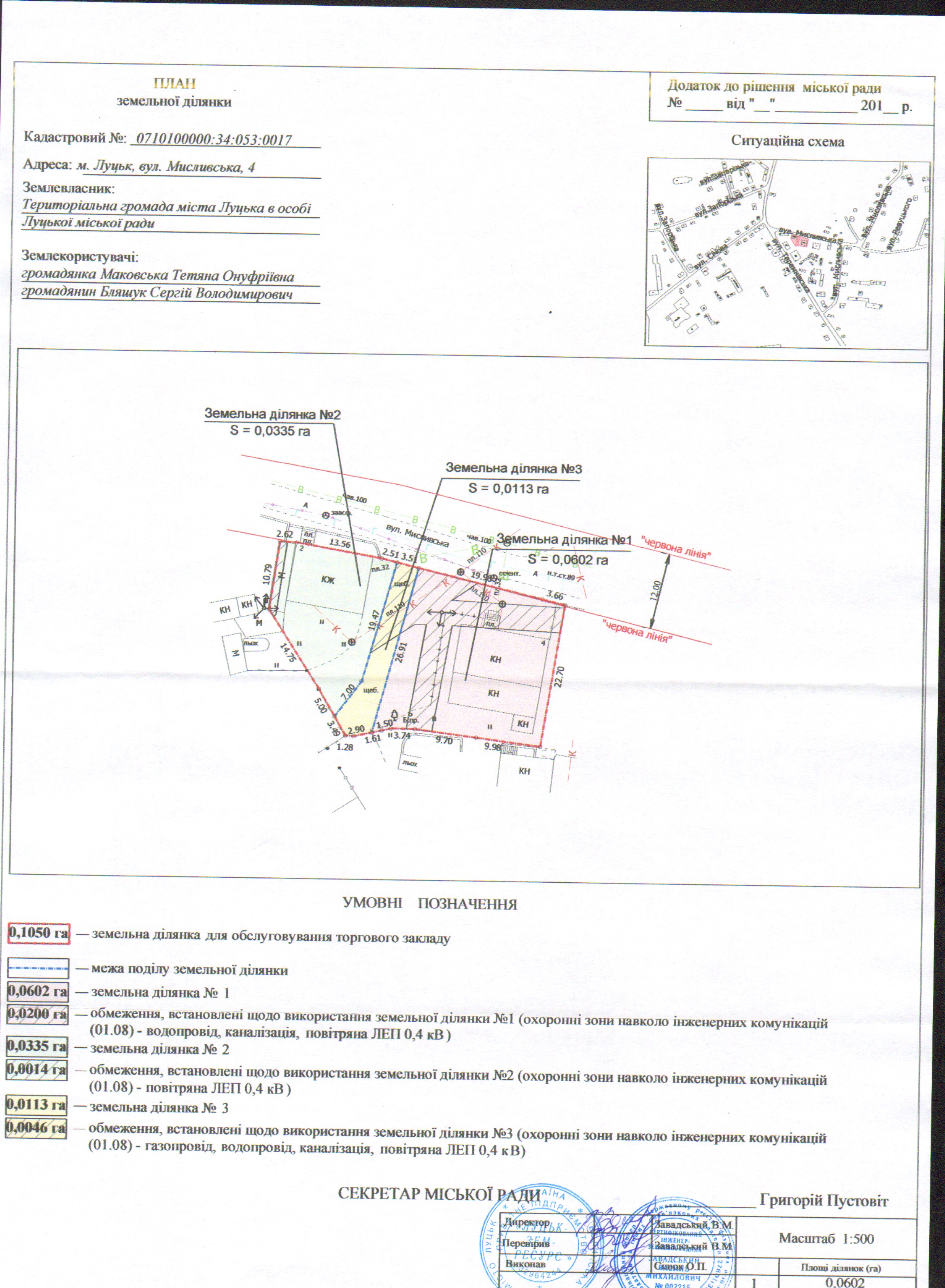 Розглянувши клопотання громадян Маковської Тетяни Онуфріївни, Бляшука Сергія Володимировича щодо поділу земельної ділянки комунальної власності на вул. Мисливській, 4, яка перебуває у користуванні для обслуговування торгового закладу, рішення Луцької міської ради від 26.07.2017 № 29/23 «Про припинення ТЕРЕМНІВСЬКОМУ СПОЖИВЧОМУ ТОВАРИСТВУ права постійного користування земельною ділянкою на вул. Мисливській, 4», відповідно до якого зареєстроване припинення права постійного користування на земельну ділянку кадастровим номером 0710100000:34:053:0017 площею 0,1050 га на вул. Мисливській, 4 у Державному реєстрі речових прав на нерухоме майно від 03.08.2017, номер запису про інше речове право: 2037489, технічну документацію із землеустрою щодо поділу та об’єднання земельних ділянок на вул. Мисливській, 4, витяг з Державного земельного кадастру про земельну ділянку від 28.04.2017 № НВ-0702957432017, керуючись статтями 12, 79-1, 186 Земельного кодексу України, статтею 56 Закону України «Про землеустрій», статтею 27 Закону України «Про Державний земельний кадастр», Законом України «Про внесення змін до деяких законодавчих актів України щодо розмежування земель державної та комунальної власності», статтею 26 Закону України «Про місцеве самоврядування в Україні», Законом України «Про державну реєстрацію речових прав на нерухоме майно та їх обтяжень», пунктами 135-136 Постанови Кабінету Міністрів України від 17.10.2012 № 1051 «Про затвердження Порядку ведення Державного земельного кадастру», міська рада