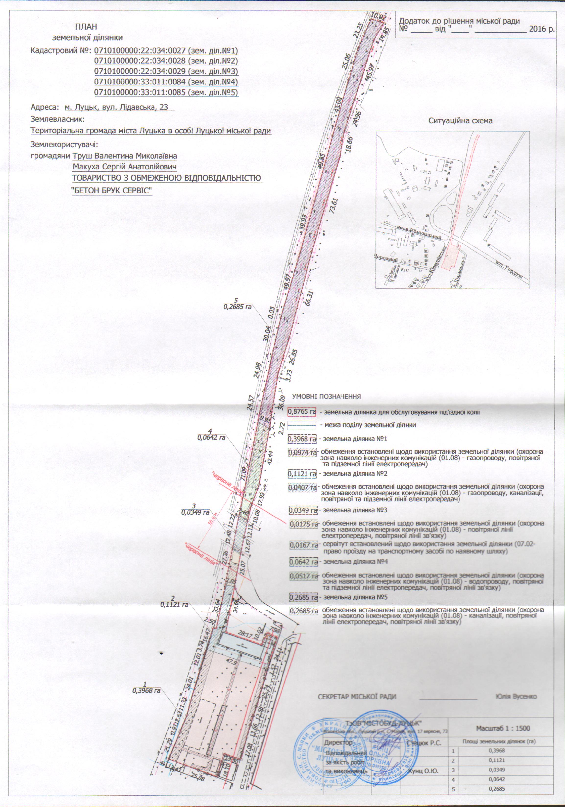 Розглянувши клопотання громадян Труш Валентини Миколаївни, Макухи Сергія Анатолійовича та ТОВАРИСТВА З ОБМЕЖЕНОЮ ВІДПОВІДАЛЬНІСТЮ «БЕТОН БРУК СЕРВІС» щодо поділу земельної ділянки комунальної власності на вул. Лідавській, 23, яка перебуває у користуванні для обслуговування під’їздної колії, договір оренди землі, укладений між Луцькою міською радою та ПРИВАТНИМ ПІДПРИЄМСТВОМ «ЗАХІДЕНЕРГОРЕСУРС», зареєстрований у Державному реєстрі земель від 21.04.2011 за № 071010004000006 (право оренди земельної ділянки зареєстроване в Державному реєстрі речових прав на нерухоме майно 20.11.2014, номер запису 7775056), припинений додатковою угодою про припинення договору оренди землі від 19.02.2016 (право оренди земельної ділянки припинене в Державному реєстрі речових прав на нерухоме майно 19.02.2016), договір суборенди землі, укладений між ПРИВАТНИМ ПІДПРИЄМСТВОМ «ЗАХІДЕНЕРГОРЕСУРС» та громадянкою Труш Валентиною Миколаївною за погодженням Луцької міської ради від 26.12.2013 (право суборенди земельної ділянки зареєстроване у Державному реєстрі речових прав на нерухоме майно від 01.12.2014, номер запису 7896137), припинений додатковою угодою про припинення договору суборенди землі (право суборенди земельної ділянки припинено в Державному реєстрі речових прав на нерухоме майно 24.02.2016), технічні документації із землеустрою щодо поділу земельної ділянки на вул. Лідавській, 23, керуючись статтями 12, 79-1, 186 Земельного кодексу України, ст. 56 Законом України «Про землеустрій», Законом України «Про Державний земельний кадастр», Законом України «Про внесення змін до деяких законодавчих актів України щодо розмежування земель державної та комунальної власності», ст. 26 Закону України “Про місцеве самоврядування в Україні”, Законом України «Про державну реєстрацію речових прав на нерухоме майно та їх обтяжень», Постановою Кабінету Міністрів України від 17.10.2012 № 1051 «Про затвердження Порядку ведення Державного земельного кадастру», міська рада