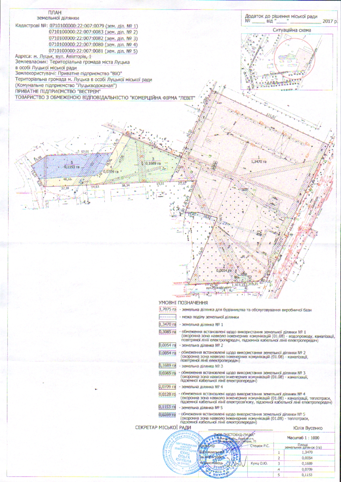Розглянувши клопотання приватного підприємства «ВІО», комунального підприємства «Луцькводоканал», ПРИВАТНОГО ПІДПРИЄМСТВА «ВЕСТРЕМ», ТОВАРИСТВА З ОБМЕЖЕНОЮ ВІДПОВІДАЛЬНІСТЮ «КОМЕРЦІЙНА ФІРМА «ЛЕВІТ» щодо поділу земельної ділянки комунальної власності на вул. Авіаторів, 1, яка перебуває у користуванні для будівництва та обслуговування виробничої бази, договір оренди землі, укладений між Луцькою міською радою та громадянином Гопанчуком Володимиром Ніфаїловичем, зареєстрований у Державному реєстрі земель від 05.10.2007 за № 040707700382, строк дії якого закінчився, акт приймання-передачі земельної ділянки від 30.12.2013, технічні документації із землеустрою щодо поділу земельних ділянок на вул. Авіаторів, 1, витяги з Державного земельного кадастру про земельні ділянки від 15.12.2016 № НВ-0702598592016 (земельна ділянка площею 1,3470 га), від 26.04.2016 № НВ-0702069922016 (земельна ділянка площею 0,0054 га), № НВ-0702069982016 (земельна ділянка площею 0,1689 га), № НВ-0702069872016 (земельна ділянка площею 0,0709 га), від 30.06.2016 № НВ-0702174922016 (земельна ділянка площею 0,1153 га), керуючись статтями 12, 79-1, 186 Земельного кодексу України, статтею 56 Закону України «Про землеустрій», статтею 27 Закону України «Про Державний земельний кадастр», Законом України «Про внесення змін до деяких законодавчих актів України щодо розмежування земель державної та комунальної власності», статтею 26 Закону України «Про місцеве самоврядування в Україні», Законом України «Про державну реєстрацію речових прав на нерухоме майно та їх обтяжень», пунктами 135-136 Постанови Кабінету Міністрів України від 17.10.2012 № 1051 «Про затвердження Порядку ведення Державного земельного кадастру», міська рада