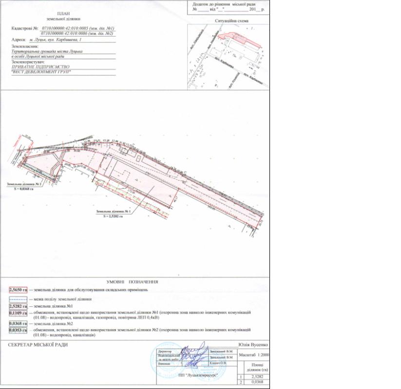 - земельна ділянка № 2 - кадастровим номером 0710100000:42:010:0086, площею 0,0368 га, для обслуговування складських приміщень, згідно з додатком.