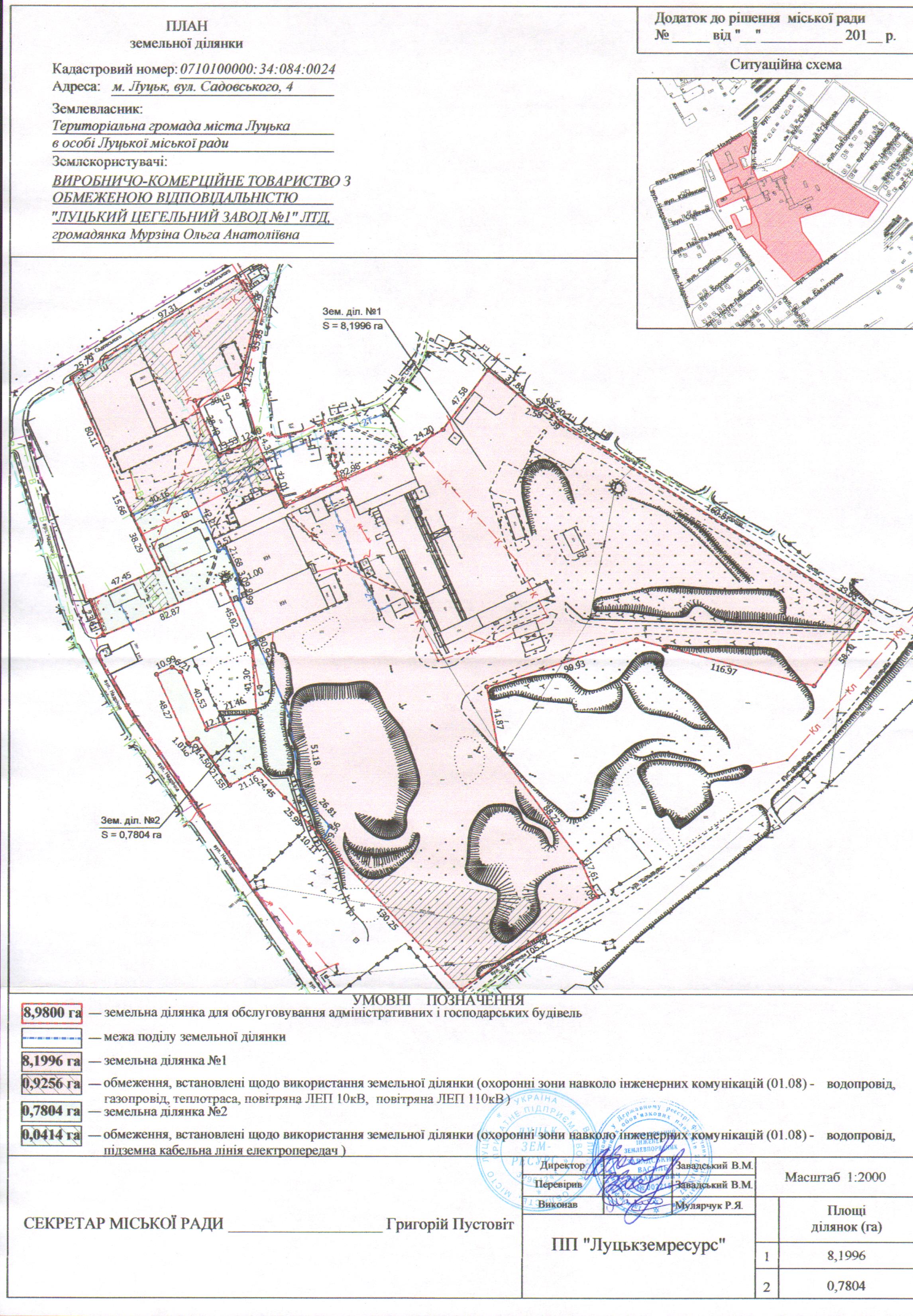 Розглянувши клопотання ВИРОБНИЧО-КОМЕРЦІЙНОГО ТОВАРИСТВА З ОБМЕЖЕНОЮ ВІДПОВІДАЛЬНІСТЮ «ЛУЦЬКИЙ ЦЕГЕЛЬНИЙ ЗАВОД № 1» ЛТД, громадянки Мурзіної Ольги Анатоліївни щодо поділу земельної ділянки комунальної власності на вул. Садовського, 4, яка перебуває у користуванні для обслуговування адміністративних і господарських будівель, рішення Луцької міської ради від 29.06.2017 № 26/23 «Про припинення ВИРОБНИЧО-КОМЕРЦІЙНОМУ ТОВАРИСТВУ З ОБМЕЖЕНОЮ ВІДПОВІДАЛЬНІСТЮ «ЛУЦЬКИЙ ЦЕГЕЛЬНИЙ ЗАВОД № 1» ЛТД права постійного користування земельною ділянкою на вул. Садовського, 4», відповідно до якого зареєстроване припинення права постійного користування земельною ділянкою площею 8,9800 га на вул. Садовського, 4 у Державному реєстрі речових прав на нерухоме майно від 24.07.2017, технічну документацію із землеустрою щодо поділу та об'єднання земельних ділянок на вул. Садовського, 4, витяг з Державного земельного кадастру про земельну ділянку від 29.08.2017 № НВ-0000780252017, керуючись статтями 12, 79-1, 186 Земельного кодексу України, статтею 56 Закону України «Про землеустрій», статтею 27 Закону України «Про Державний земельний кадастр», Законом України «Про внесення змін до деяких законодавчих актів України щодо розмежування земель державної та комунальної власності», статтею 26 Закону України «Про місцеве самоврядування в Україні», Законом України «Про державну реєстрацію речових прав на нерухоме майно та їх обтяжень», пунктами 135-136 Постанови Кабінету Міністрів України від 17.10.2012 № 1051 «Про затвердження Порядку ведення Державного земельного кадастру», міська рада
