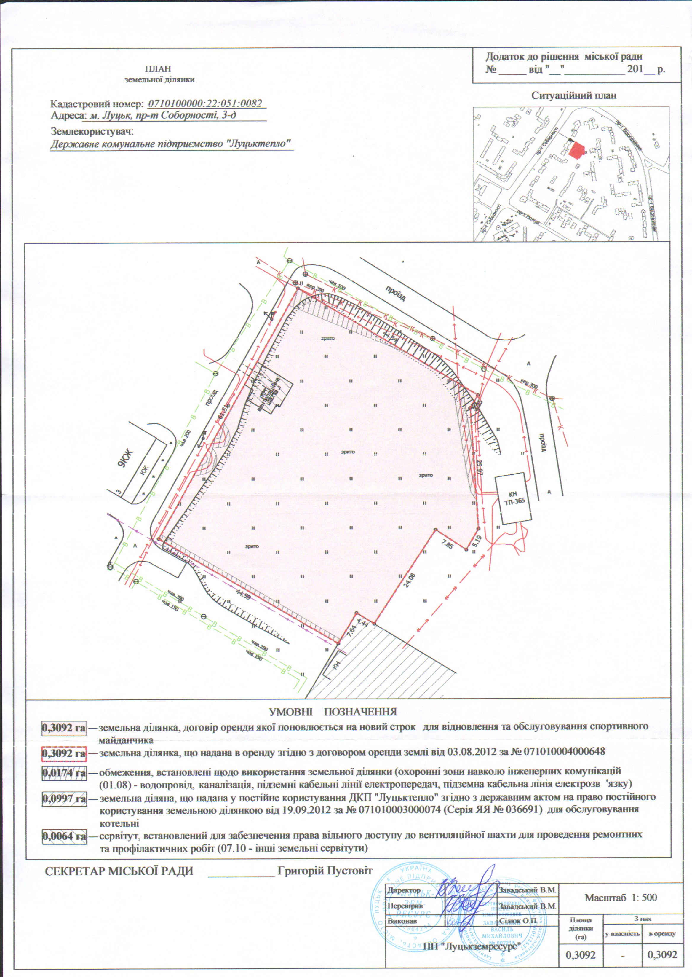 Луцьктепло» щодо поновлення договору оренди землі, зареєстрованого у Державному реєстрі земель від 03.08.2012 за № 071010004000648 (право оренди земельної ділянки зареєстроване в Державному реєстрі речових прав на нерухоме майно 11.11.2016, номер запису про інше речове право: 17851143), витяг з Державного земельного кадастру про земельну ділянку від 02.11.2017 № НВ-0703501482017, керуючись статтями 12, 93, 96 Земельного кодексу України, статтею 33 Закону України «Про оренду землі», статтею 4 Закону України «Про державну реєстрацію речових прав на нерухоме майно та їх обтяжень», Законом України «Про внесення змін до деяких законодавчих актів України щодо розмежування земель державної та комунальної власності», статтею 26 Закону України «Про місцеве самоврядування в Україні», пунктами 162, 171 Постанови Кабінету Міністрів України від 17.10.2012 № 1051 «Про затвердження Порядку ведення Державного земельного кадастру», пунктами 8, 30 договору оренди землі, міська рада