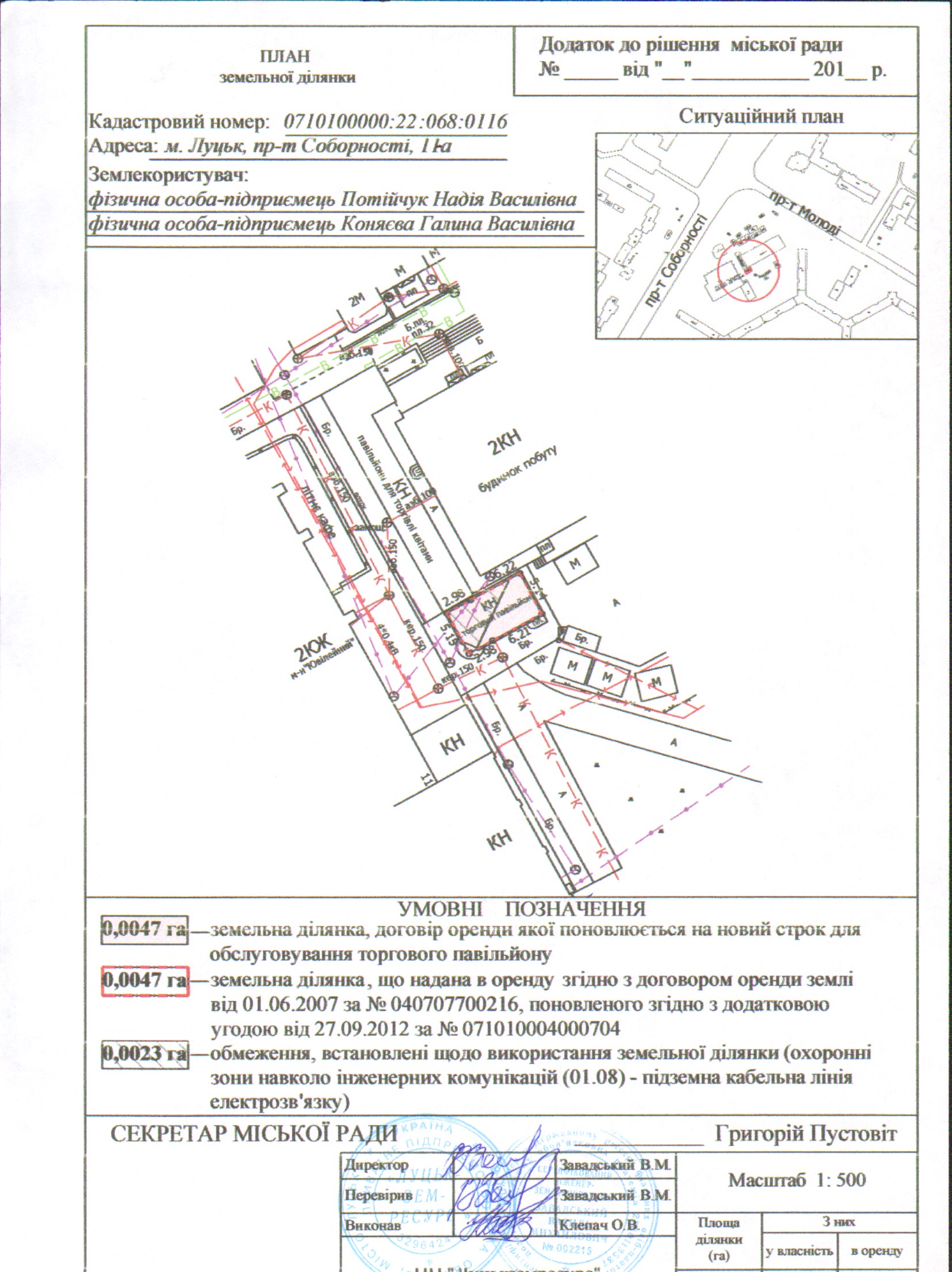1. Продовжити фізичним особам-підприємцям Потійчук Надії Василівні, Коняєвій Галині Василівні термін оренди земельної ділянки на пр-ті Соборності, 11-а строком на 5 років з дати закінчення договору оренди землі (до 27.09.2022), площею 0,0047 га, кадастровим номером 0710100000:22:068:0116, для обслуговування торгового павільйону, згідно з додатком.