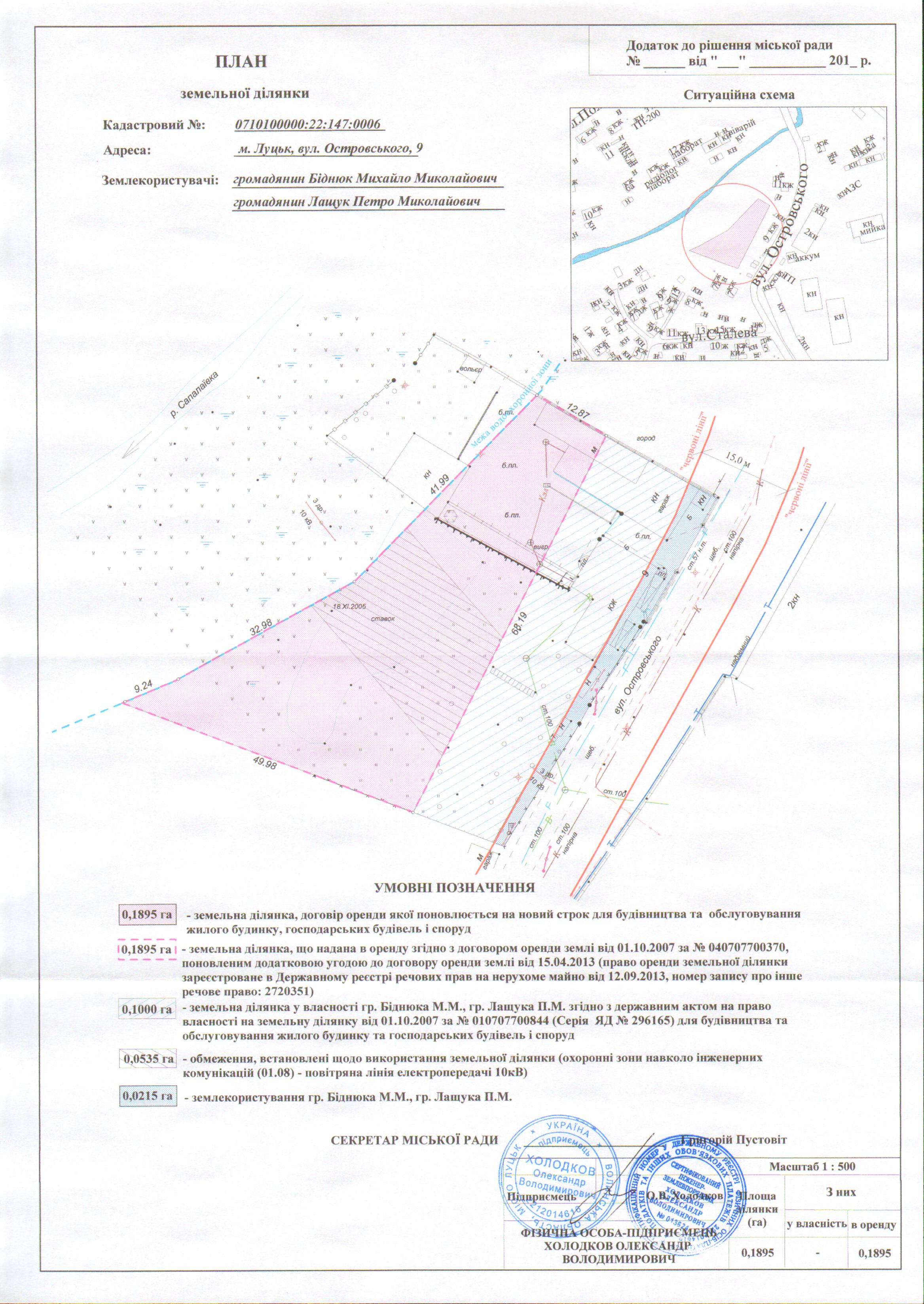 Розглянувши клопотання громадян Біднюка Михайла Миколайовича, Лащука Петра Миколайовича щодо поновлення договору оренди землі, зареєстрованого у Державному реєстрі земель від 01.10.2007 за № 040707700370, поновленого додатковою угодою про поновлення договору оренди землі від 15.04.2013 (право оренди земельної ділянки зареєстроване в Державному реєстрі речових прав на нерухоме майно від 12.09.2013, номер запису про інше речове право: 2720351), враховуючи правовстановлюючі документи громадян Лащука Петра Миколайовича, Біднюка Михайла Миколайовича на об’єкти нерухомого майна на вул. Островського, 9: договір дарування житлового будинку від 04.10.2004 за № 3-1747, відповідно до якого право власності громадянина Біднюка Михайла Миколайовича на 67/100 часток житлового будинку з надвірними будівлями і спорудами зареєстроване 10.11.2004, реєстраційний номер: 7379208; свідоцтво на право особистої власності на жилий будинок від 18.04.1988, відповідно до якого право власності громадянина Лащука Петра Миколайовича на 33/100 часток житлового будинку з надвірними будівлями і спорудами зареєстроване 19.04.1988, реєстраційний номер: 1060; технічний паспорт на об’єкт нерухомого майна від 16.11.2007; державний акт на право власності на земельну ділянку площею 0,1000 га, зареєстрований в Книзі записів реєстрації державних актів на право власності на землю та на право постійного користування землею, договорів оренди землі від 01.10.2007 за № 010707700844, керуючись статтями 12, 93, 96 Земельного кодексу України, статтею 33 Закону України «Про оренду землі», статтею 4 Закону України «Про державну реєстрацію речових прав на нерухоме майно та їх обтяжень», Законом України «Про внесення змін до деяких законодавчих актів України щодо розмежування земель державної та комунальної власності», статтею 26 Закону України «Про місцеве самоврядування в Україні», пунктами 162, 171 Постанови Кабінету Міністрів України від 17.10.2012 № 1051 «Про затвердження Порядку ведення Державного земельного кадастру», пунктами 8, 30 договору оренди землі, міська рада
