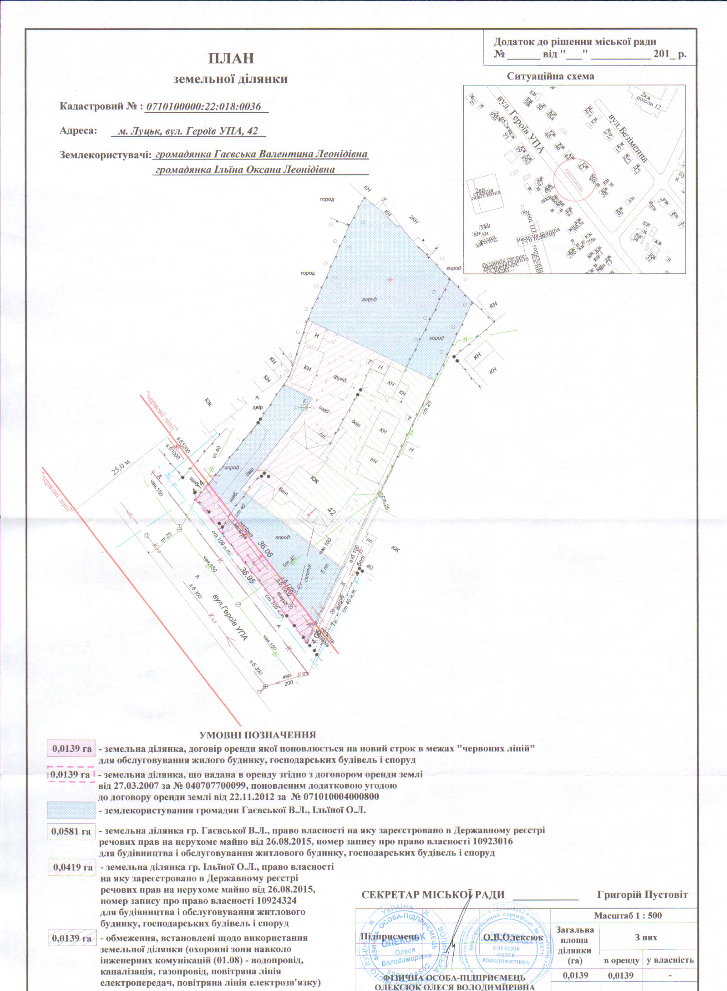 Розглянувши клопотання громадян Гаєвської Валентини Леонідівни, Ільїної Оксани Леонідівни щодо поновлення договору оренди землі, зареєстрованого у Державному реєстрі земель від 27.03.2007 за № 040707700099, поновленого додатковою угодою до договору оренди землі, зареєстрованою у Державному реєстрі земель від 22.11.2012 за № 071010004000800, витяг з Державного земельного кадастру про земельну ділянку від 22.12.2017 № НВ-0703673252017, враховуючи правовстановлюючі документи громадян Гаєвської Валентини Леонідівни, Ільїної Оксани Леонідівни на об’єкти нерухомого майна на вул. Героїв УПА, 42: договір дарування від 27.03.1991 за № 2-1379, відповідно до якого право власності громадянки Гаєвської Валентини Леонідівни на 43/100 частки жилого будинку з надвірними будівлями зареєстроване 12.04.1991 за реєстровим № 2036; договір дарування від 23.03.1998 за № 2-1043, відповідно до якого право власності громадянки Ільїної Оксани Леонідівни на 57/100 частки житлового будинку з надвірними будівлями і спорудами зареєстроване 06.04.1998, за реєстровим № 2036, технічний паспорт на об’єкт нерухомого майна від 25.11.2014; інформаційну довідку з Державного реєстру речових прав на нерухоме майно від 27.12.2017 за № 109229902, відповідно до якої право власності громадянки Гаєвської Валентини Леонідівни на земельну ділянку площею 0,0419 га зареєстроване 26.08.2015, номер запису про право власності: 10924324, та право власності громадянки Ільїної Оксани Леонідівни на земельну ділянку площею 0,0581 га зареєстроване 26.08.2015, номер запису про право власності: 10923016, керуючись статтями 12, 93, 96 Земельного кодексу України, статтею 33 Закону України “Про оренду землі”, Законом України “Про Державний земельний кадастр”, статтею 4 Закону України “Про державну реєстрацію речових прав на нерухоме майно та їх обтяжень”, Законом України “Про внесення змін до деяких законодавчих актів України щодо розмежування земель державної та комунальної власності”, статтею 26 Закону України “Про місцеве самоврядування в Україні”, пунктами 162, 171 Постанови Кабінету Міністрів України від 17.10.2012 № 1051 “Про затвердження Порядку ведення Державного земельного кадастру”, пунктами 8, 30 договору оренди землі, міська рада
