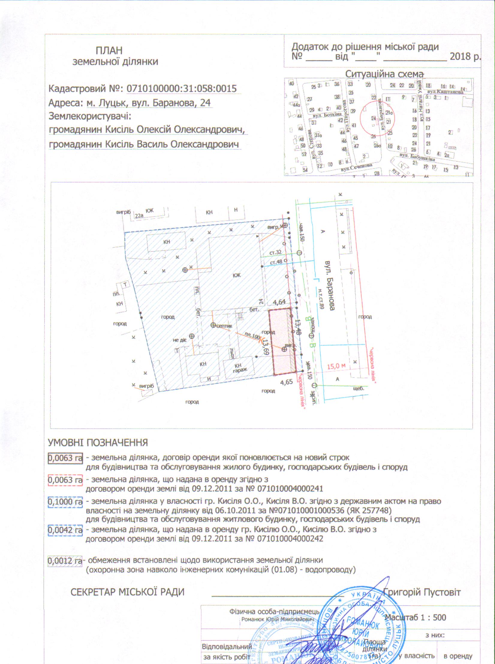 Розглянувши клопотання громадян Кисіля Олексія Олександровича, Кисіля Василя Олександровича щодо поновлення договору оренди землі, зареєстрованого у Державному реєстрі земель від 09.12.2011 за № 071010004000241, витяг з Державного земельного кадастру про земельну ділянку від 13.12.2017 № НВ-0001097082017, враховуючи правовстановлюючі документи громадян Кисіля Олексія Олександровича, Кисіля Василя Олександровича на об’єкти нерухомого майна на вул. Баранова, 24: свідоцтво про право власності від 27.02.2013 за № 824114, відповідно до якого право власності громадянина Кисіля Олексія Олександровича на 64/100 частки житлового будинку з надвірними будівлями і спорудами зареєстроване в Державному реєстрі речових прав на нерухоме майно від 05.02.2013, номер запису про право власності: 236079; договір дарування від 10.06.1985 за №1-2004, відповідно до якого право власності громадянина Кисіля Василя Олександровича на 13/100 частки житлового будинку з надвірними спорудами зареєстроване 21.07.1985 за № 1449; свідоцтво про право на спадщину за законом від 09.07.1986 за № 1-3475, відповідно до якого право власності громадянина Кисіля Олексія Олександровича на 87/600 частки житлового будинку з надвірними спорудами зареєстроване 09.10.1987; технічний паспорт на об’єкт нерухомого майна від 28.11.2012; державний акт на право власності на земельну ділянку площею 0,1000 га, зареєстрований в Книзі записів реєстрації державних актів на право власності на землю та на право постійного користування землею, договорів оренди землі від 06.04.2011 за № 071010001000536, керуючись статтями 12, 93, 96 Земельного кодексу України, статтею 33 Закону України “Про оренду землі”, Законом України “Про Державний земельний кадастр”, статтею 4 Закону України “Про державну реєстрацію речових прав на нерухоме майно та їх обтяжень”, Законом України “Про внесення змін до деяких законодавчих актів України щодо розмежування земель державної та комунальної власності”, статтею 26 Закону України “Про місцеве самоврядування в Україні”, пунктами 162, 171 Постанови Кабінету Міністрів України від 17.10.2012 № 1051 “Про затвердження Порядку ведення Державного земельного кадастру”, пунктами 8, 30 договору оренди землі, міська рада