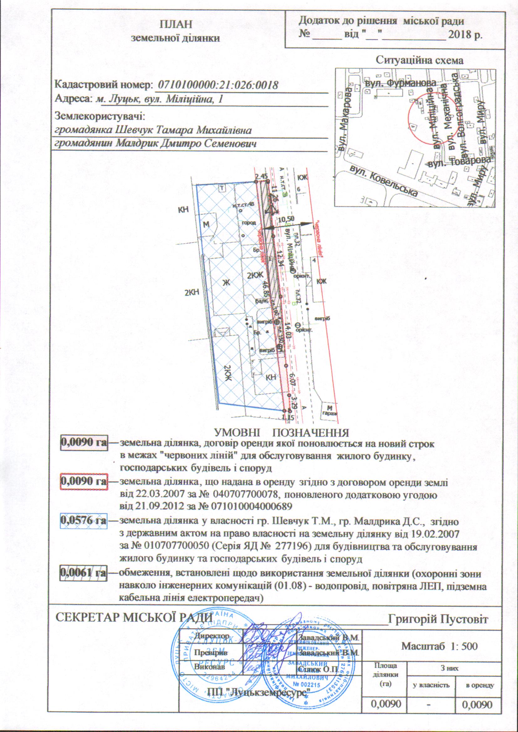 Розглянувши клопотання громадян Шевчук Тамари Михайлівни, Малдрика Дмитра Семеновича щодо поновлення договору оренди землі, зареєстрованого у Державному реєстрі земель від 22.03.2007 за № 040707700078, поновленого додатковою угодою до договору оренди землі, зареєстрованою у Державному реєстрі земель від 21.09.2012 за № 071010004000689, витяг з Державного земельного кадастру про земельну ділянку від 04.04.2018 за № НВ-0703984682018, враховуючи правовстановлюючі документи громадян Шевчук Тамари Михайлівни, Малдрика Дмитра Семеновича на об’єкти нерухомого майна на вул. Міліційній, 1: свідоцтво про право на спадщину за заповітом від 22.07.2003 за № 3-1702, відповідно до якого право власності громадянки Шевчук Тамари Михайлівни на 1/2 частку житлового будинку з надвірними будівлями зареєстроване 10.10.2003, реєстраційний номер: 1880152; дублікат договору від 31.05.1984 за № 2-2066, відповідно до якого право власності громадянина Малдрика Дмитра Семеновича на 1/2 частку житлового будинку з надвірними будівлями зареєстроване 05.12.2007, реєстраційний номер: 1880152, технічний паспорт на житловий будинок від 05.08.2003; державний акт на право власності на земельну ділянку площею 0,0576 га, зареєстрований в Книзі записів реєстрації державних актів на право власності на землю та на право постійного користування землею, договорів оренди землі від 19.02.2007 за № 010707700050, керуючись статтями 12, 93, 96 Земельного кодексу України, статтею 33 Закону України «Про оренду землі», статтею 4 Закону України «Про державну реєстрацію речових прав на нерухоме майно та їх обтяжень», Законом України «Про внесення змін до деяких законодавчих актів України щодо розмежування земель державної та комунальної власності», статтею 26 Закону України «Про місцеве самоврядування в Україні», пунктами 162, 171 Постанови Кабінету Міністрів України від 17.10.2012 № 1051 «Про затвердження Порядку ведення Державного земельного кадастру», пунктами 8, 30 договору оренди землі, міська рада