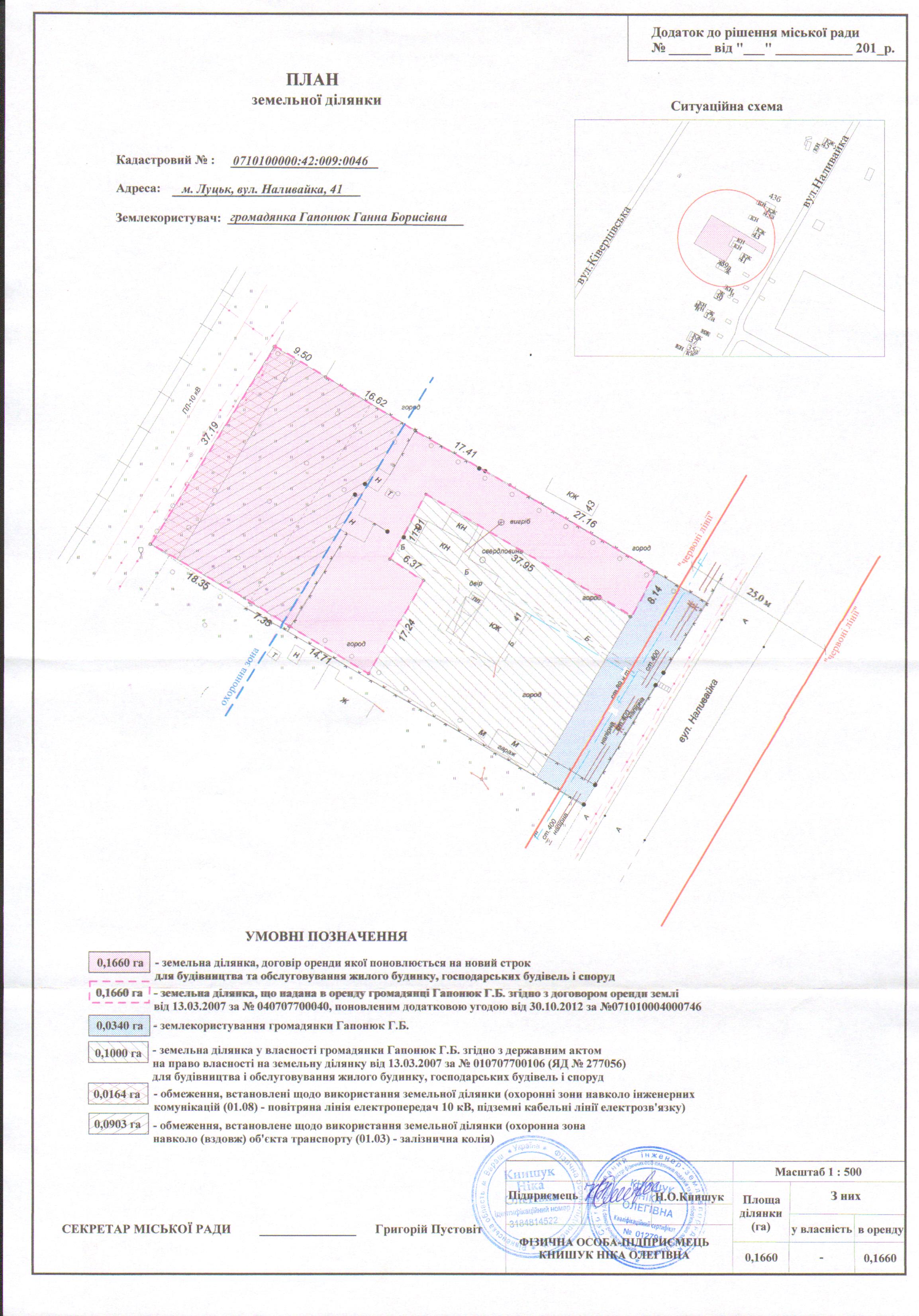 Розглянувши клопотання громадянки Гапонюк Ганни Борисівни щодо поновлення договору оренди землі, зареєстрованого у Державному реєстрі земель від 13.03.2007 за № 040707700040, поновленого додатковою угодою про поновлення договору оренди землі, зареєстрованою у Державному реєстрі земель від 30.10.2012 за № 071010004000746, витяг з Державного земельного кадастру про земельну ділянку від 02.05.2018 № НВ-0704051322018, враховуючи правовстановлюючі документи громадянки Гапонюк Ганни Борисівни на об’єкти нерухомого майна на вул. Наливайка, 41: свідоцтво про право на спадщину за заповітом від 01.10.2004 за № 2-1286, відповідно до якого право власності на житловий будинок з надвірними будівлями зареєстроване 15.10.2004, реєстраційний номер: 7372831, технічний паспорт на об’єкт нерухомого майна від 14.10.2004; державний акт на право власності на земельну ділянку площею 0,1000 га, зареєстрований в Книзі записів реєстрації державних актів на право власності на землю та на право постійного користування землею, договорів оренди землі від 13.03.2007 за № 010707700106, керуючись статтями 12, 93, 96 Земельного кодексу України, статтею 33 Закону України «Про оренду землі», статтею 4 Закону України «Про державну реєстрацію речових прав на нерухоме майно та їх обтяжень», Законом України «Про внесення змін до деяких законодавчих актів України щодо розмежування земель державної та комунальної власності», статтею 26 Закону України «Про місцеве самоврядування в Україні», пунктами 162, 171 Постанови Кабінету Міністрів України від 17.10.2012 № 1051 «Про затвердження Порядку ведення Державного земельного кадастру», пунктами 8, 30 договору оренди землі, міська рада