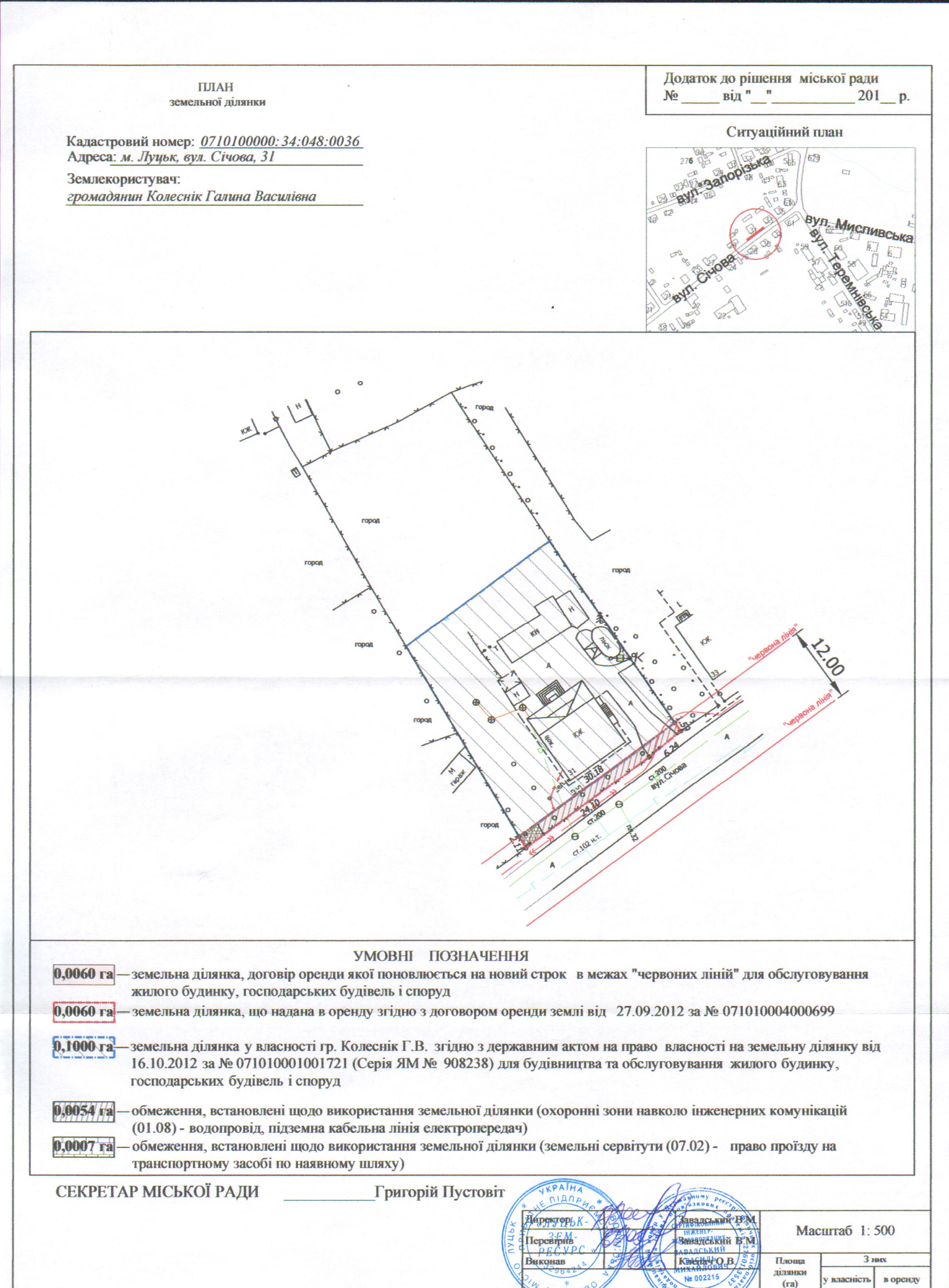 1. Продовжити громадянці Колеснік Галині Василівні термін оренди земельної ділянки на вул. Січовій, 31 строком на 25 років з дати закінчення договору оренди землі (до 27.09.2042), площею 0,0060 га, кадастровим номером 0710100000:34:048:0036, в межах «червоних ліній» для обслуговування жилого будинку, господарських будівель і споруд, згідно з додатком.