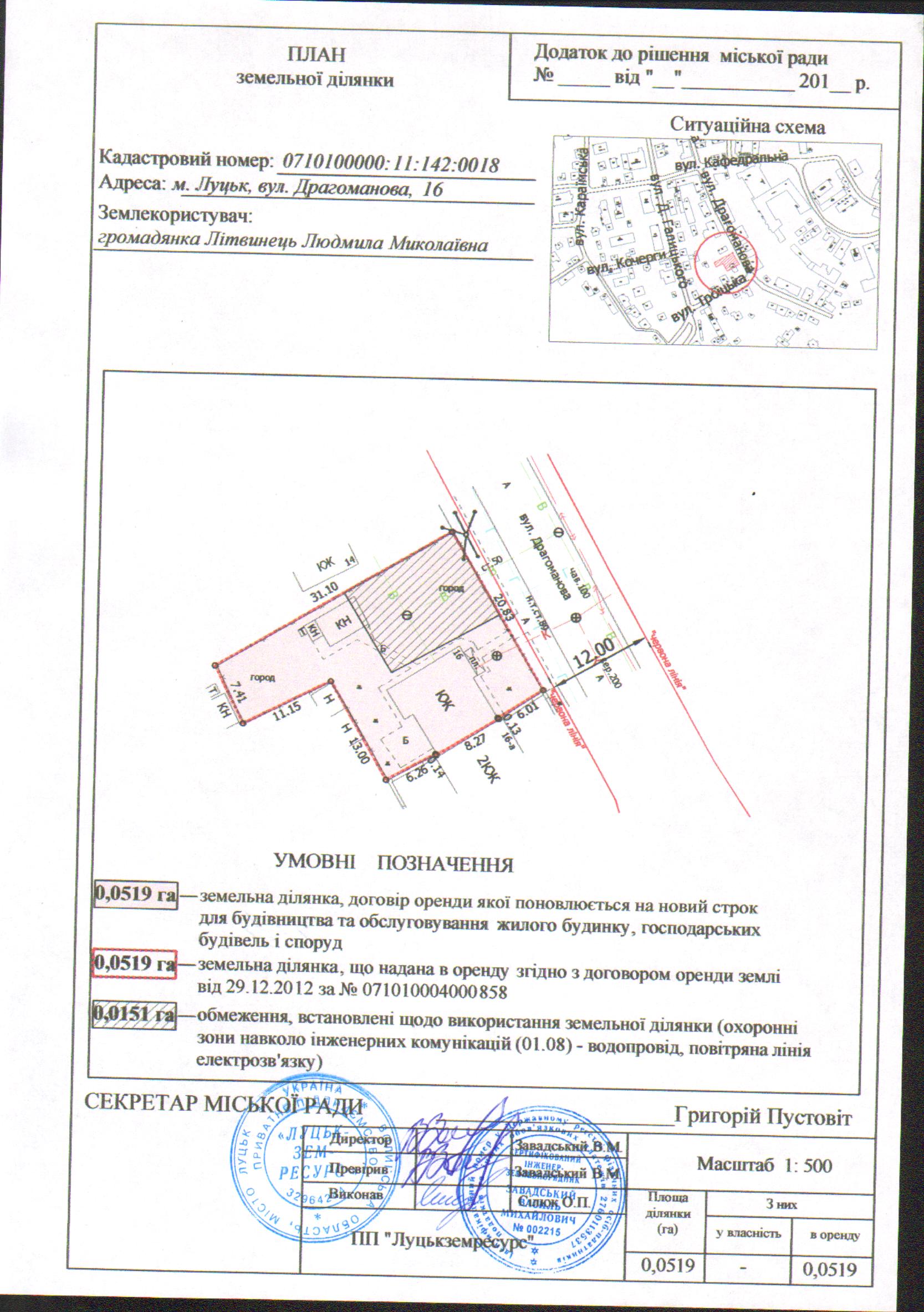 Розглянувши клопотання громадянки Літвинець Людмили Миколаївни щодо поновлення договору оренди землі, зареєстрованого у Державному реєстрі земель від 29.12.2012 за № 071010004000858, витяг з Державного земельного кадастру про земельну ділянку від 06.03.2018 № НВ-0703894082018, враховуючи правовстановлюючі документи громадянки Літвинець Людмили Миколаївни на об’єкт нерухомого майна на вул. Драгоманова, 16: договір купівлі-продажу від 29.08.2012 за №1023, відповідно до якого право власності житловий будинок з надвірними будівлями і спорудами зареєстроване 03.09.2012, реєстраційний номер: 16900605; технічний паспорт на об’єкт нерухомого майна від 31.08.2012; враховуючи інформацію Адміністрації Державного історико-культурного заповідника у м. Луцьку Волинської обласної державної адміністрації від 04.04.2018 № 139/1-11, керуючись статтями 12, 53-54, 93, 96 Земельного кодексу України, статтею 33 Закону України «Про оренду землі», Законом України «Про Державний земельний кадастр», статтею 4 Закону України «Про державну реєстрацію речових прав на нерухоме майно та їх обтяжень», Законом України «Про внесення змін до деяких законодавчих актів України щодо розмежування земель державної та комунальної власності», статтею 26 Закону України «Про місцеве самоврядування в Україні», пунктами 162, 171 Постанови Кабінету Міністрів України від 17.10.2012 № 1051 «Про затвердження Порядку ведення Державного земельного кадастру», пунктами 8, 30 договору оренди землі, міська рада