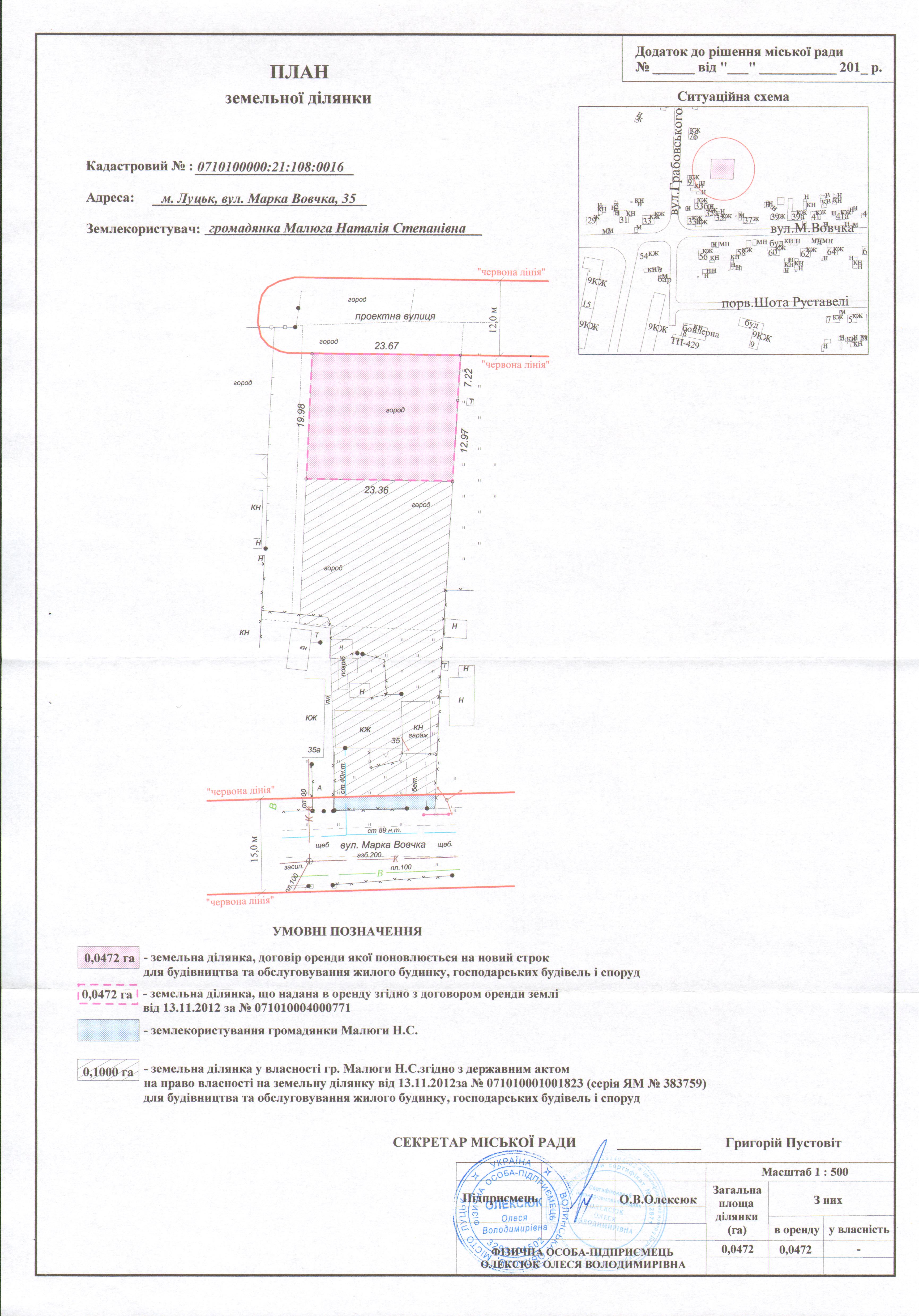 Розглянувши клопотання громадянки Малюги Наталії Степанівни щодо поновлення договору оренди землі, зареєстрованого у Державному реєстрі земель від 13.11.2012 за № 071010004000771, витяг з Державного земельного кадастру про земельну ділянку від 24.01.2018 № НВ-0001194742018, враховуючи правовстановлюючі документи громадянки Малюги Наталії Степанівни на об’єкти нерухомого майна на вул. Марка Вовчка, 35: договір дарування житлового будинку від 16.04.2010 за № 3-368, відповідно до якого право власності на житловий будинок з надвірними будівлями та спорудами зареєстроване 20.04.2010, реєстраційний номер: 1547419, технічний паспорт на об’єкт нерухомого майна від 19.04.2010; державний акт на право власності на земельну ділянку площею 0,1000 га, зареєстрований в Книзі записів реєстрації державних актів на право власності на землю та на право постійного користування землею, договорів оренди землі від 13.11.2012 за № 071010001001823, витяг з протоколу пленарного засідання тридцять восьмої сесії міської ради сьомого скликання від 28.02.2018, витяг з протоколу пленарного засідання сорок другої сесії міської ради сьомого скликання від 30.05.2018, керуючись статтями 12, 93, 96 Земельного кодексу України, статтею 33 Закону України «Про оренду землі», статтею 4 Закону України «Про державну реєстрацію речових прав на нерухоме майно та їх обтяжень», Законом України «Про внесення змін до деяких законодавчих актів України щодо розмежування земель державної та комунальної власності», статтею 26 Закону України «Про місцеве самоврядування в Україні», пунктами 162, 171 Постанови Кабінету Міністрів України від 17.10.2012 № 1051 «Про затвердження Порядку ведення Державного земельного кадастру», пунктами 8, 30 договору оренди землі, міська рада