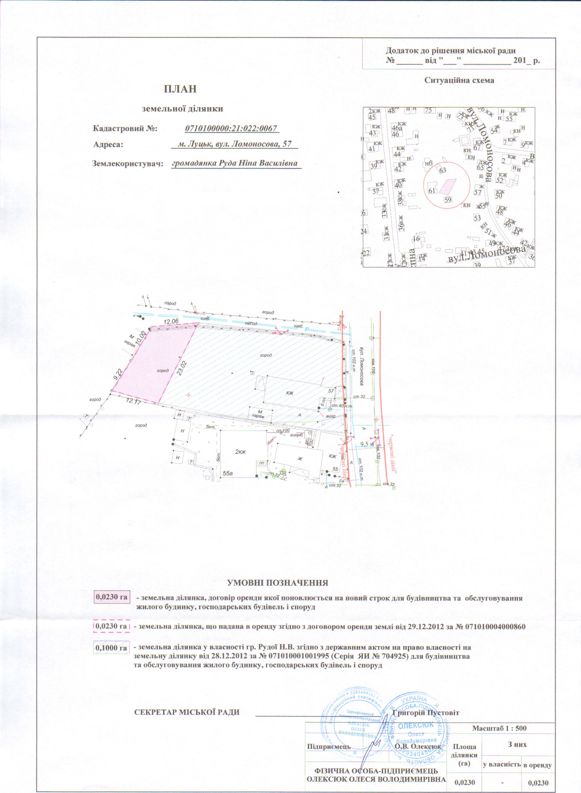 1. Продовжити громадянці Рудій Ніні Василівні термін оренди земельної ділянки на вул. Ломоносова, 57 строком на 25 років з дати закінчення договору оренди землі (до 29.12.2042), площею 0,0230 га, кадастровим номером 0710100000:21:022:0067, для будівництва та обслуговування жилого будинку, господарських будівель і споруд, згідно з додатком.