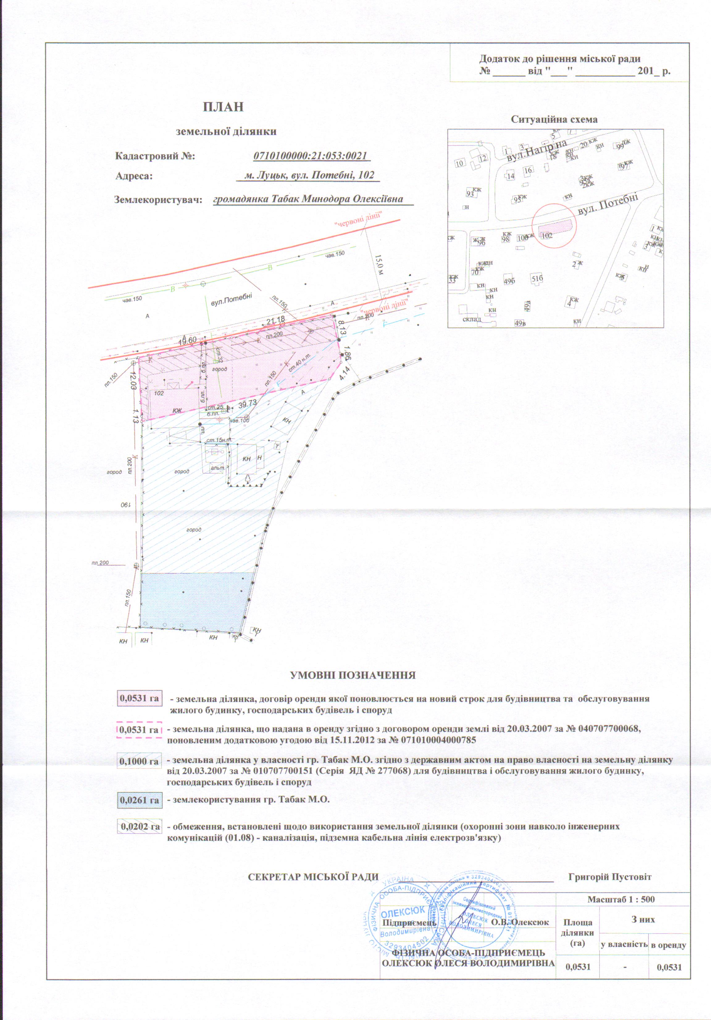 Розглянувши клопотання громадянки Табак Минодори Олексіївни щодо поновлення договору оренди землі, зареєстрованого у Державному реєстрі земель від 20.03.2007 за № 040707700068, поновленого додатковою угодою про поновлення договору оренди землі, зареєстрованою у Державному реєстрі земель від 15.11.2012 за № 071010004000785, витяг з Державного земельного кадастру про земельну ділянку від 18.01.2018 № НВ-0703744882018, враховуючи правовстановлюючі документи громадянки Табак Минодори Олексіївни на об’єкти нерухомого майна на вул. Потебні, 102: свідоцтво про право на спадщину за законом від 02.09.1992 за № 2-5219, відповідно до якого право власності на житловий будинок з господарськими та побутовими спорудами зареєстроване 16.02.1993 за № 3518; технічний паспорт на об’єкт нерухомого майна від 10.01.2007; державний акт на право власності на земельну ділянку площею 0,1000 га, зареєстрований в Книзі записів реєстрації державних актів на право власності на землю та на право постійного користування землею, договорів оренди землі від 20.03.2007 за № 010707700151, керуючись статтями 12, 93, 96 Земельного кодексу України, статтею 33 Закону України “Про оренду землі”, Законом України “Про Державний земельний кадастр”, статтею 4 Закону України “Про державну реєстрацію речових прав на нерухоме майно та їх обтяжень”, Законом України “Про внесення змін до деяких законодавчих актів України щодо розмежування земель державної та комунальної власності”, статтею 26 Закону України “Про місцеве самоврядування в Україні”, пунктами 162, 171 Постанови Кабінету Міністрів України від 17.10.2012 № 1051 “Про затвердження Порядку ведення Державного земельного кадастру”, пунктами 8, 30 договору оренди землі, міська рада