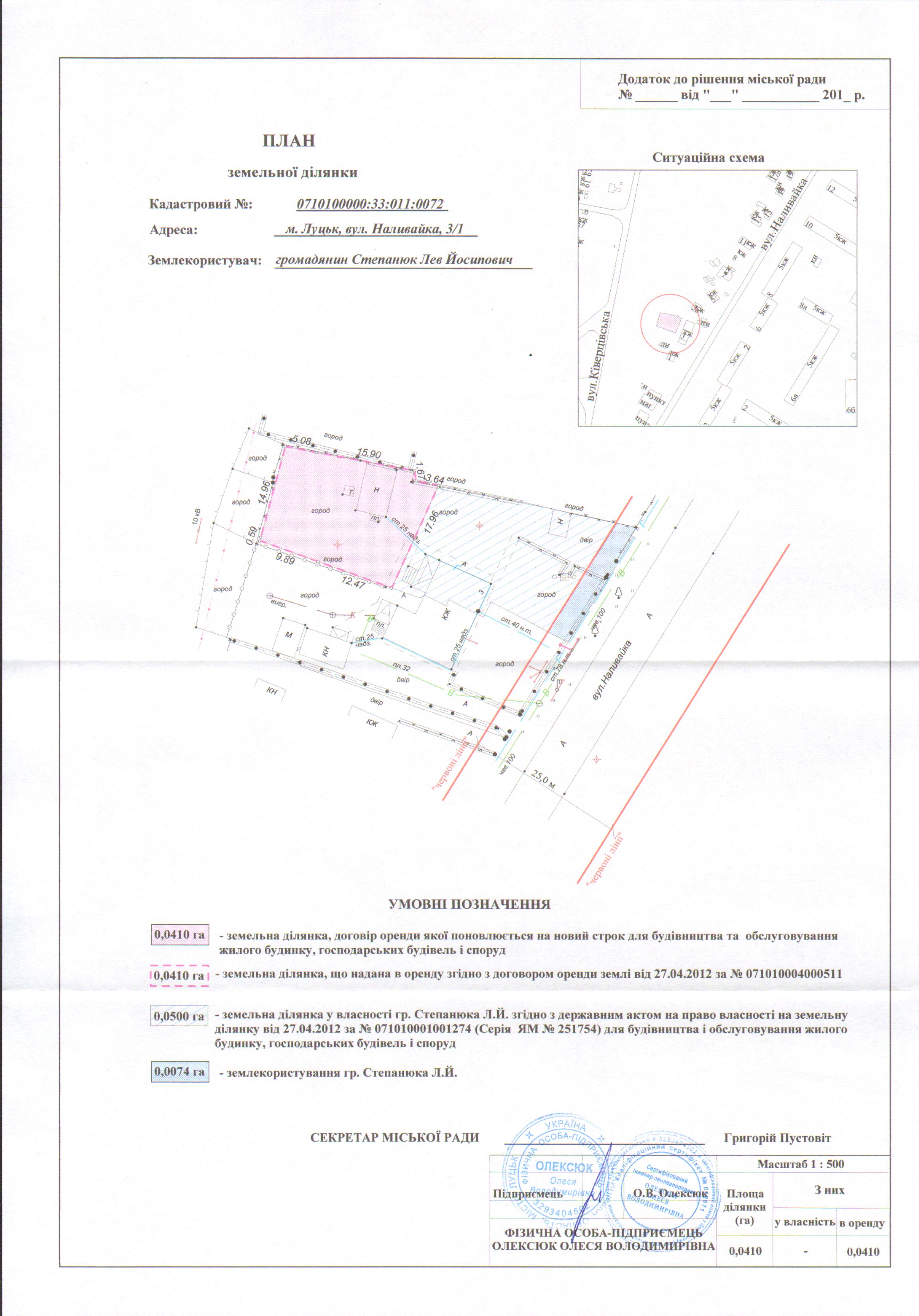 Розглянувши клопотання громадянина Степанюка Лева Йосиповича щодо поновлення договору оренди землі, зареєстрованого у Державному реєстрі земель від 27.04.2012 за № 071010004000511, витяг з Державного земельного кадастру про земельну ділянку від 16.01.2018 № НВ-0703736232018, враховуючи правовстановлюючі документи громадянина Степанюка Лева Йосиповича на об’єкти нерухомого майна на вул. Наливайка, 3/1: рішення Луцького міськрайонного суду від 04.12.2009, справа № 2-8111/2009, відповідно до якого право власності на 14/25 часток житлового будинку з надвірними спорудами та господарськими будівлями зареєстроване 22.09.2010, реєстраційний номер: 31566042, технічний паспорт на садибний (індивідуальний) житловий будинок від 25.06.2013; державний акт на право власності на земельну ділянку площею 0,0500 га, зареєстрований в Книзі записів реєстрації державних актів на право власності на землю та на право постійного користування землею, договорів оренди землі від 27.04.2012 за № 071010001001274, керуючись статтями 12, 93, 96 Земельного кодексу України, статтею 33 Закону України «Про оренду землі», статтею 4 Закону України «Про державну реєстрацію речових прав на нерухоме майно та їх обтяжень», Законом України «Про внесення змін до деяких законодавчих актів України щодо розмежування земель державної та комунальної власності», статтею 26 Закону України «Про місцеве самоврядування в Україні», пунктами 162, 171 Постанови Кабінету Міністрів України від 17.10.2012 № 1051 «Про затвердження Порядку ведення Державного земельного кадастру», пунктами 8, 30 договору оренди землі, міська рада