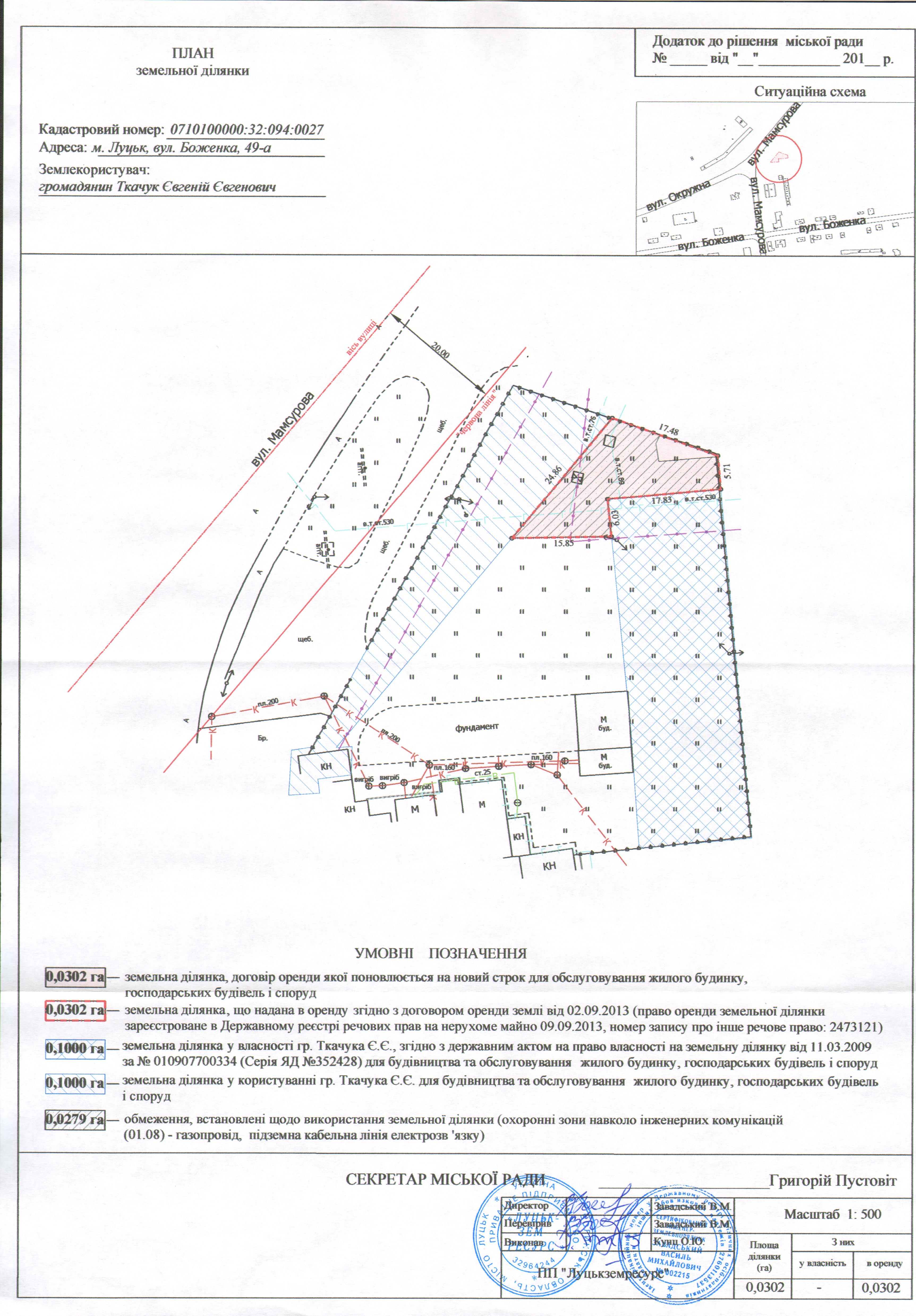 Розглянувши клопотання громадянина Ткачука Євгенія Євгеновича щодо поновлення договору оренди землі, укладеного з Луцькою міською радою 02.09.2013 (право оренди земельної ділянки зареєстровано в Державному реєстрі речових прав на нерухоме майно 09.09.2013, номер запису про інше речове право: 2473121), витяг з Державного земельного кадастру про земельну ділянку від 17.09.2018 № НВ-0002049252018, враховуючи правовстановлюючі документи громадянина Ткачука Євгенія Євгеновича на об’єкт нерухомого майна на вул. Боженка, 49-а: державний акт на право власності на земельну ділянку площею 0,1000 га, зареєстрований в Книзі записів реєстрації державних актів на право власності на землю та на право постійного користування землею, договорів оренди землі від 11.03.2009 за № 010907700334, керуючись статтями 12, 93, 96, 124-126 Земельного кодексу України, статтею 33 Закону України «Про оренду землі», Законом України «Про державну реєстрацію речових прав на нерухоме майно та їх обтяжень», Законом України «Про Державний земельний кадастр», Законом України «Про внесення змін до деяких законодавчих актів України щодо розмежування земель державної та комунальної власності», статтею 26 Закону України «Про місцеве самоврядування в Україні», Постановою Кабінету Міністрів України від 17.10.2012 № 1051 «Про затвердження Порядку ведення Державного земельного кадастру», пунктами 8, 30 договору оренди землі, міська рада