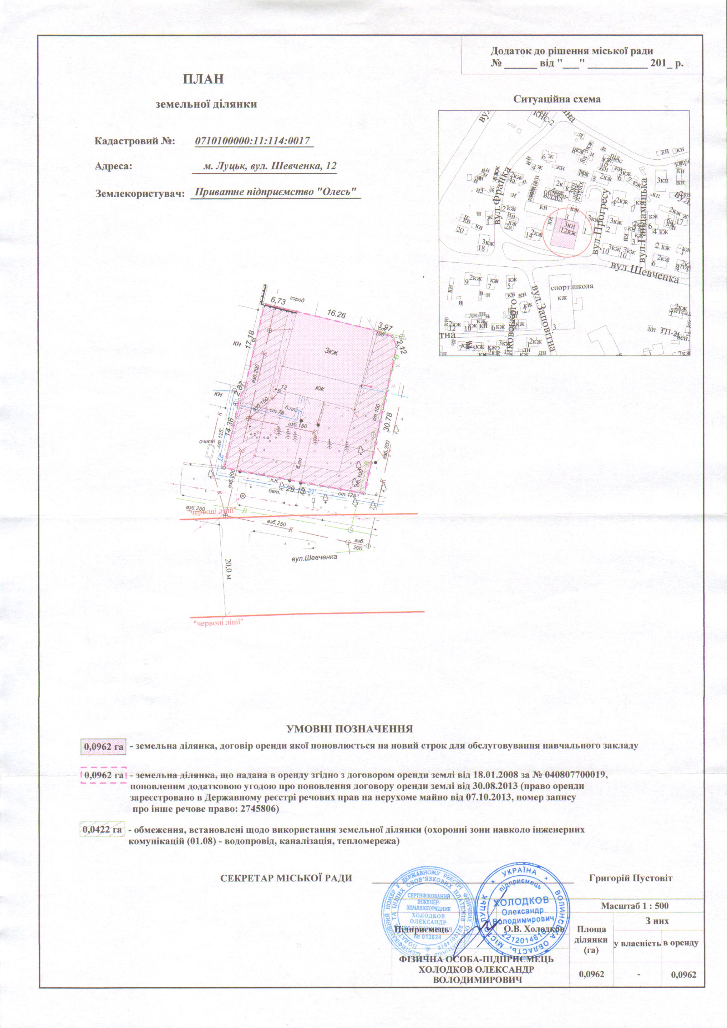 Розглянувши клопотання Приватного підприємства «Олесь» щодо поновлення договору оренди землі, зареєстрованого у Державному реєстрі земель від 18.01.2008 за № 040807700019, поновленого додатковою угодою про поновлення договору оренди землі від 30.08.2013 (право оренди земельної ділянки зареєстроване в Державному реєстрі речових прав на нерухоме майно від 07.10.2013, номер запису про інше речове право: 2745806), витяг з Державного земельного кадастру про земельну ділянку від 27.07.2018 № НВ-0704309192018, враховуючи правовстановлюючі документи Приватного підприємства «Олесь» на об’єкти нерухомого майна на вул. Шевченка, 12: договір купівлі-продажу від 01.04.2005 за № 1164, відповідно до якого право власності на нежитлове приміщення загальною площею 476,3 кв.м зареєстроване 15.04.2005, реєстраційний номер: 10249811, технічний паспорт на об’єкт нерухомого майна 15.04.2005; договір купівлі-продажу від 22.08.2007 за № 2880, відповідно до якого право власності на нежитлове приміщення загальною площею 45,8 кв.м зареєстроване 11.09.2007, реєстраційний номер: 19954109, технічний паспорт на об’єкт нерухомого майна від 03.09.2007, керуючись статтями 12, 93, 96 Земельного кодексу України, статтею 33 Закону України «Про оренду землі», статтею 4 Закону України «Про державну реєстрацію речових прав на нерухоме майно та їх обтяжень», Законом України «Про внесення змін до деяких законодавчих актів України щодо розмежування земель державної та комунальної власності», статтею 26 Закону України «Про місцеве самоврядування в Україні», пунктами 162, 171 Постанови Кабінету Міністрів України від 17.10.2012 № 1051 «Про затвердження Порядку ведення Державного земельного кадастру», витягом з протоколу № 58 засідання постійної комісії з питань земельних відносин та земельного кадастру від 19.09.2013, пунктами 8, 30 договору оренди землі, міська рада