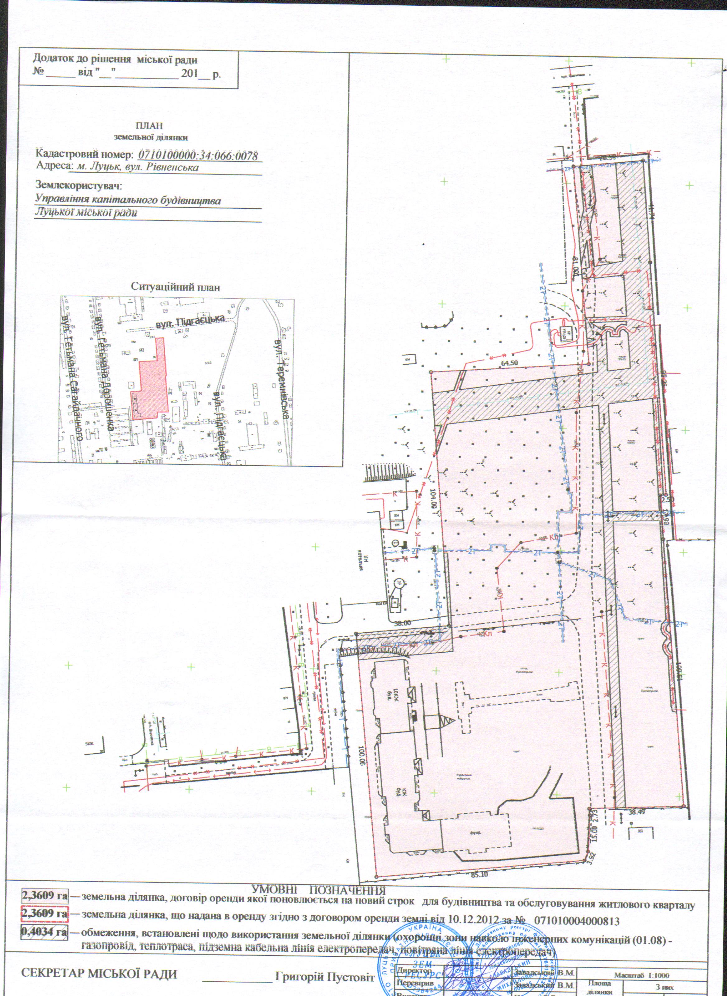 Розглянувши клопотання управління капітального будівництва Луцької міської ради щодо поновлення договору оренди землі, зареєстрованого у Державному реєстрі земель від 10.12.2012 за № 071010004000813 (право оренди земельної ділянки зареєстроване у Державному реєстрі речових прав на нерухоме майно 11.09.2014, номер запису про інше речове право: 6961284), витяг з Державного земельного кадастру про земельну ділянку від 24.11.2017 № НВ-0001027152017, враховуючи договір суборенди земельної ділянки, укладений між управлінням капітального будівництва Луцької міської ради та приватним підприємством «ГРАНДЕКС» за погодженням Луцької міської ради, від 22.04.2013 (право суборенди земельної ділянки зареєстроване в Державному реєстрі речових прав на нерухоме майно 19.09.2014, номер запису про інше речове право: 7094689), декларацію про початок виконання будівельних робіт (нове будівництво багатоквартирного житлового будинку № 1 на вул. Рівненській, 113), видану управлінням державної архітектурно-будівельної інспекції у Волинській області від 05.08.2015 № ВЛ 083152170125 приватному підприємству «ГРАНДЕКС», витяг з протоколу пленарного засідання тридцять шостої сесії міської ради сьомого скликання від 22.12.2017, керуючись статтями 12, 93, 96 Земельного кодексу України, статтею 33 Закону України «Про оренду землі», Законом України «Про Державний земельний кадастр», статтею 4 Закону України «Про державну реєстрацію речових прав на нерухоме майно та їх обтяжень», Законом України «Про внесення змін до деяких законодавчих актів України щодо розмежування земель державної та комунальної власності», статтею 26 Закону України «Про місцеве самоврядування в Україні», пунктами 162, 171 Постанови Кабінету Міністрів України від 17.10.2012 № 1051 «Про затвердження Порядку ведення Державного земельного кадастру», пунктами 8, 30 договору оренди землі, міська рада