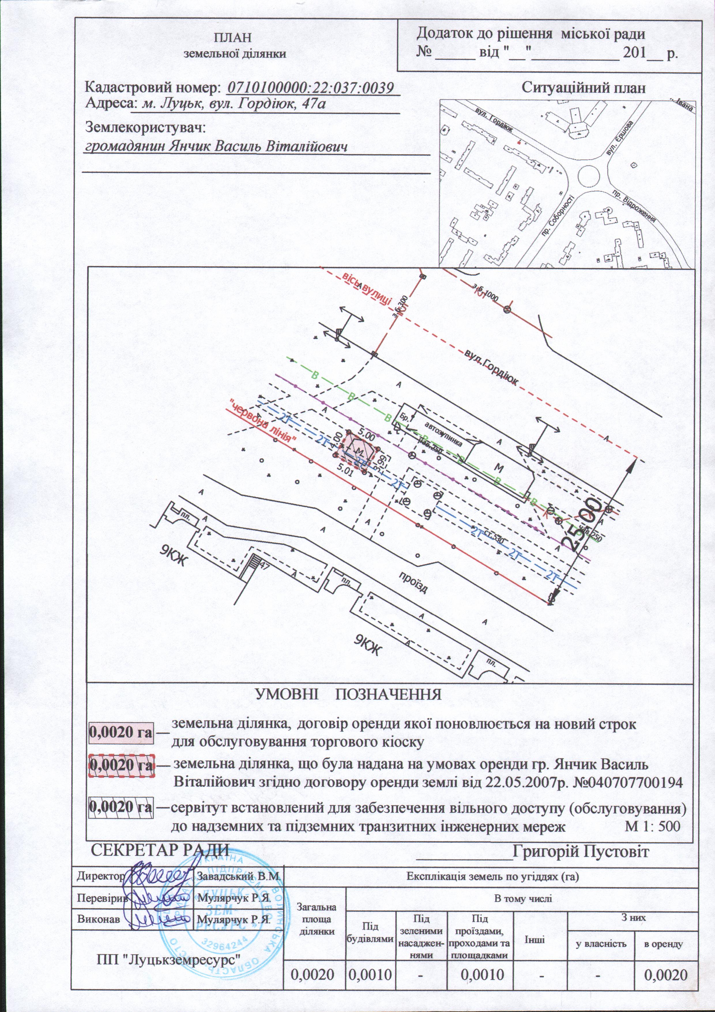 1. Відмовити у поновленні громадянину Янчику Василю Віталійовичу терміну оренди земельної ділянки на вул. Гордіюк, 47а площею 0,0020 га для обслуговування торгового кіоску.