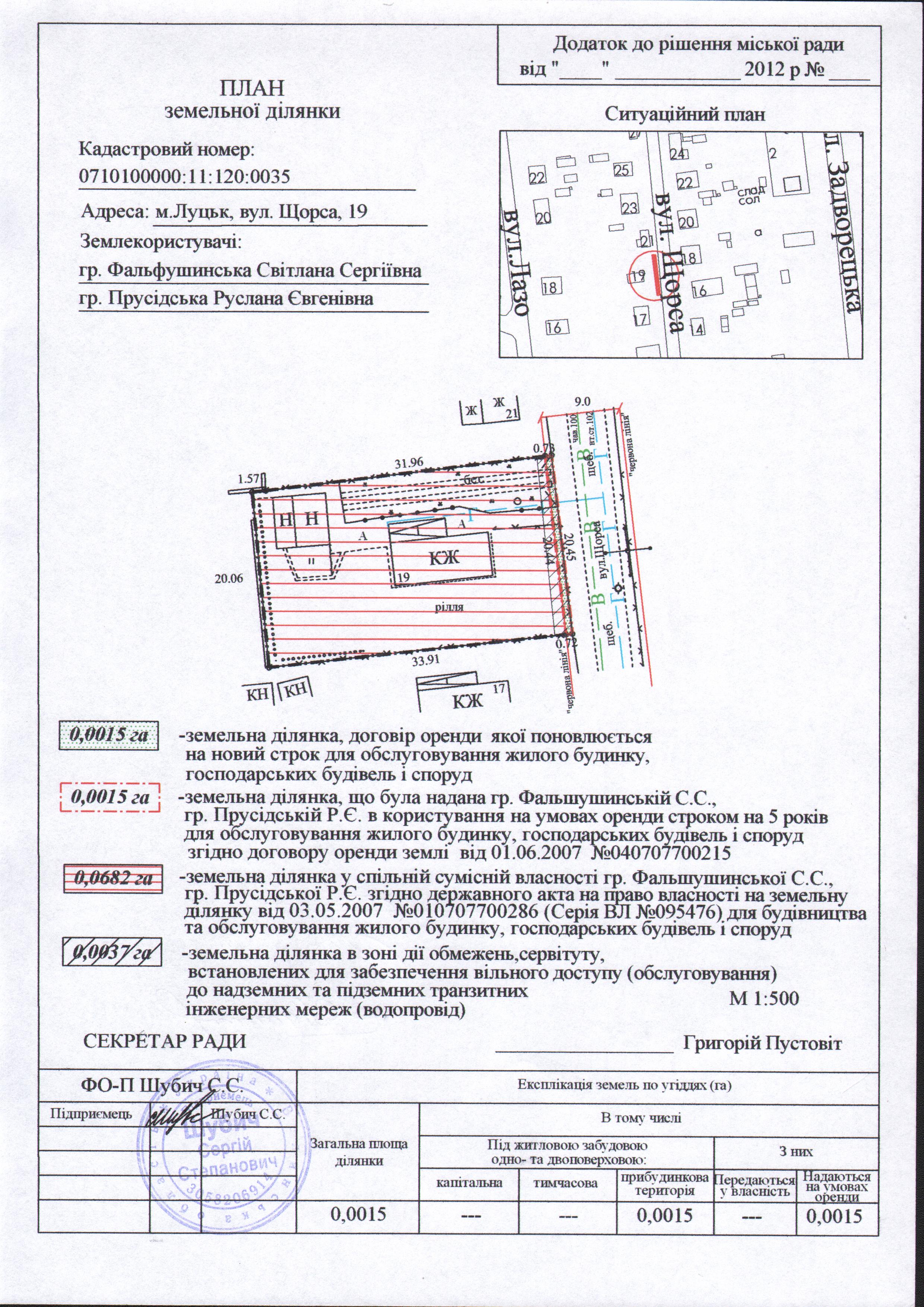 1. Продовжити громадянам Фальфушинській Світлані Сергіївні, Прусідській Руслані Євгенівні термін оренди земельної ділянки на вул. Щорса, 19 площею 0,0015 га строком на 5 років в межах «червоних ліній» для обслуговування жилого будинку, господарських будівель і споруд, згідно з додатком.