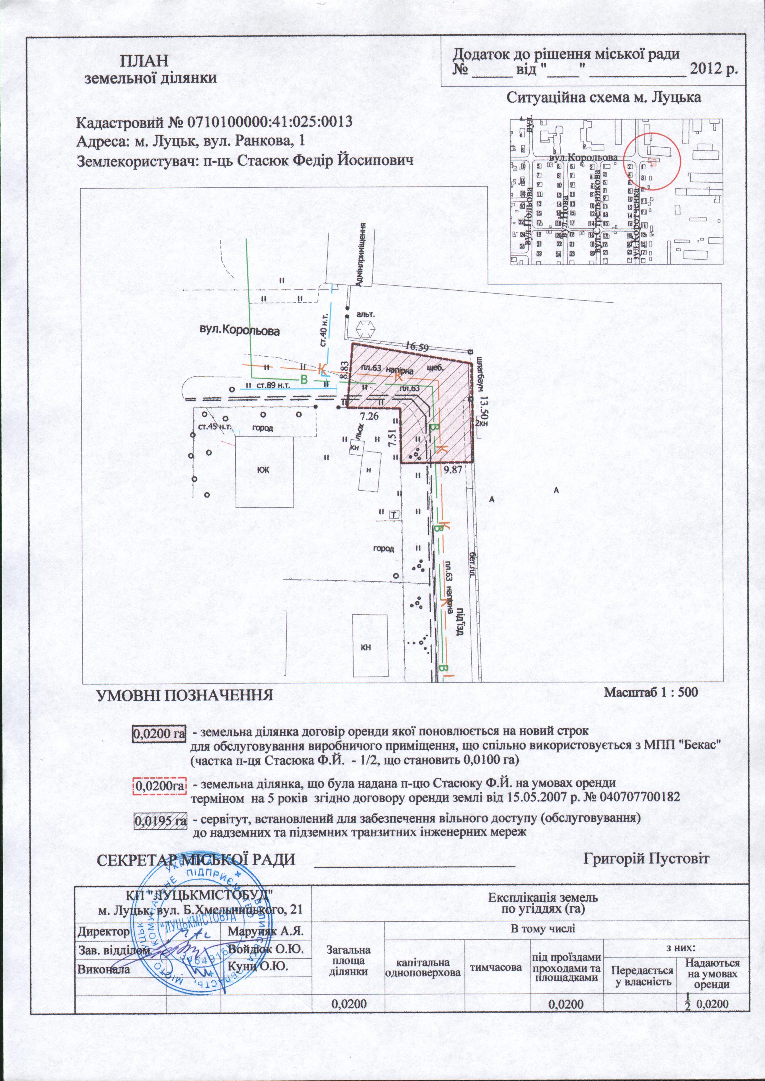 Розглянувши клопотання підприємця Стасюка Федора Йосиповича щодо поновлення договору оренди землі, зареєстрованого в Державному реєстрі земель від 15.05.2007 за № 040707700182, рішення Луцької міської ради від 25.04.2012 № 23/51 «Про поновлення договорів оренди землі МПП «Бекас» для обслуговування виробничої бази на вул. Ранковій, 1», керуючись статтями 12, 124-126 Земельного кодексу України, ст. 33 Закону України «Про оренду землі», ст. 26 Закону України “Про місцеве самоврядування в Україні”, Законом України «Про дозвільну систему у сфері господарської діяльності», пунктами 8, 29 договору оренди землі, міська рада