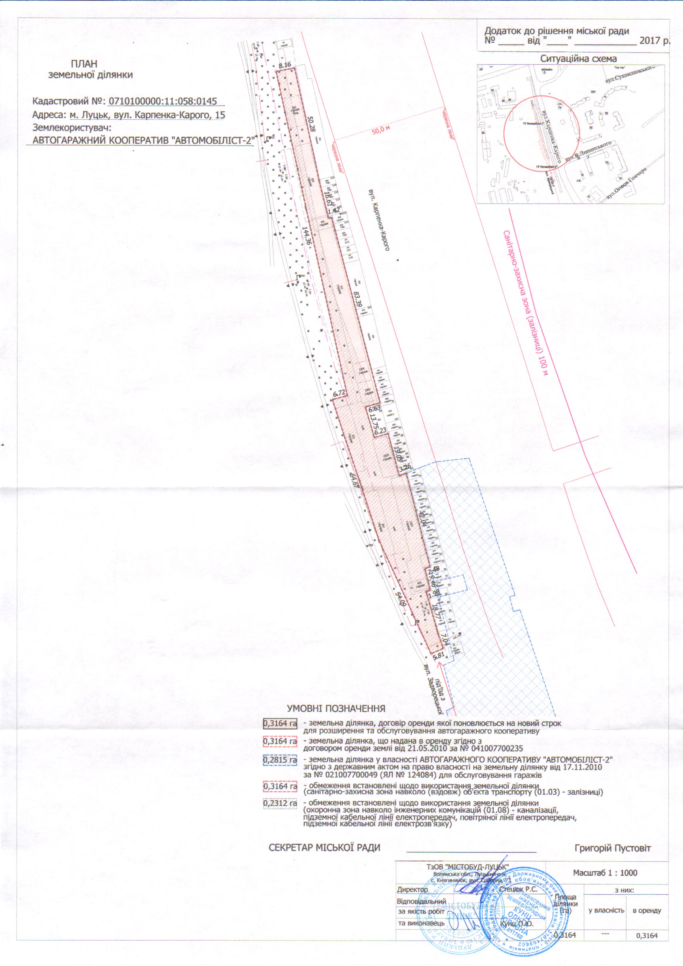 1. Продовжити АВТОГАРАЖНОМУ КООПЕРАТИВУ «АВТОМОБІЛІСТ-2» термін оренди земельної ділянки на вул. Карпенка-Карого, 15 строком на 10 років з дати закінчення договору оренди землі (до 21.05.2025), площею 0,3164 га, кадастровим номером 0710100000:11:058:0145, для розширення та обслуговування автогаражного кооперативу, згідно з додатком.