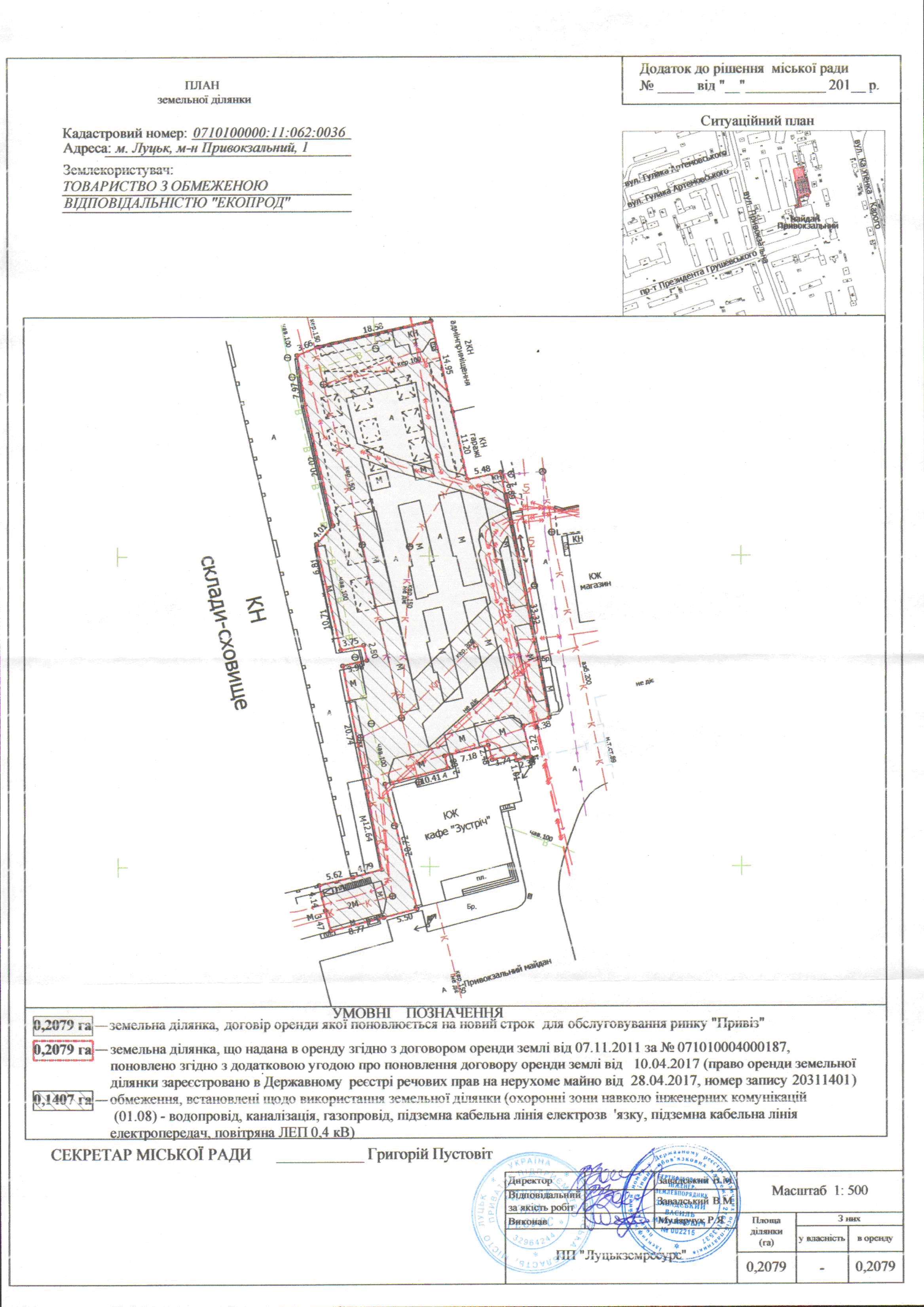 Розглянувши клопотання ТОВАРИСТВА З ОБМЕЖЕНОЮ ВІДПОВІДАЛЬНІСТЮ «ЕКОПРОД» щодо поновлення договору оренди землі, зареєстрованого у Державному реєстрі земель від 07.11.2011 за № 071010004000187, поновленого згідно з додатковою угодою про поновлення договору оренди землі від 10.04.2017, відповідно до якої право оренди земельної ділянки зареєстроване в Державному реєстрі речових прав на нерухоме майно від 28.04.2017, номер запису про інше речове право: 20311401, витяг з Державного земельного кадастру про земельну ділянку від 30.10.2017 № НВ-0000947682017, враховуючи схему розміщення тимчасових металевих конструкцій на м-ні Привокзальному, 1 від 24.10.2017 № 26, технічний паспорт на магазин з адмінприміщенням від 17.11.2016, технічний паспорт на приміщення для інвентаря від 17.11.2016, технічний паспорт на вбиральню від 17.11.2016, рішення виконавчого комітету Луцької міської ради від 17.08.2017 № 479-1 «Про затвердження детального плану території в межах проспекту Президента Грушевського, Привокзального майдану та вулиці Привокзальної у місті Луцьку», керуючись статтями 12, 93, 96 Земельного кодексу України, статтею 33 Закону України «Про оренду землі», статтею 4 Закону України «Про державну реєстрацію речових прав на нерухоме майно та їх обтяжень», Законом України «Про внесення змін до деяких законодавчих актів України щодо розмежування земель державної та комунальної власності», статтею 26 Закону України «Про місцеве самоврядування в Україні», пунктами 162, 171 Постанови Кабінету Міністрів України від 17.10.2012 № 1051 «Про затвердження Порядку ведення Державного земельного кадастру», пунктами 7, 24 договору оренди землі, міська рада