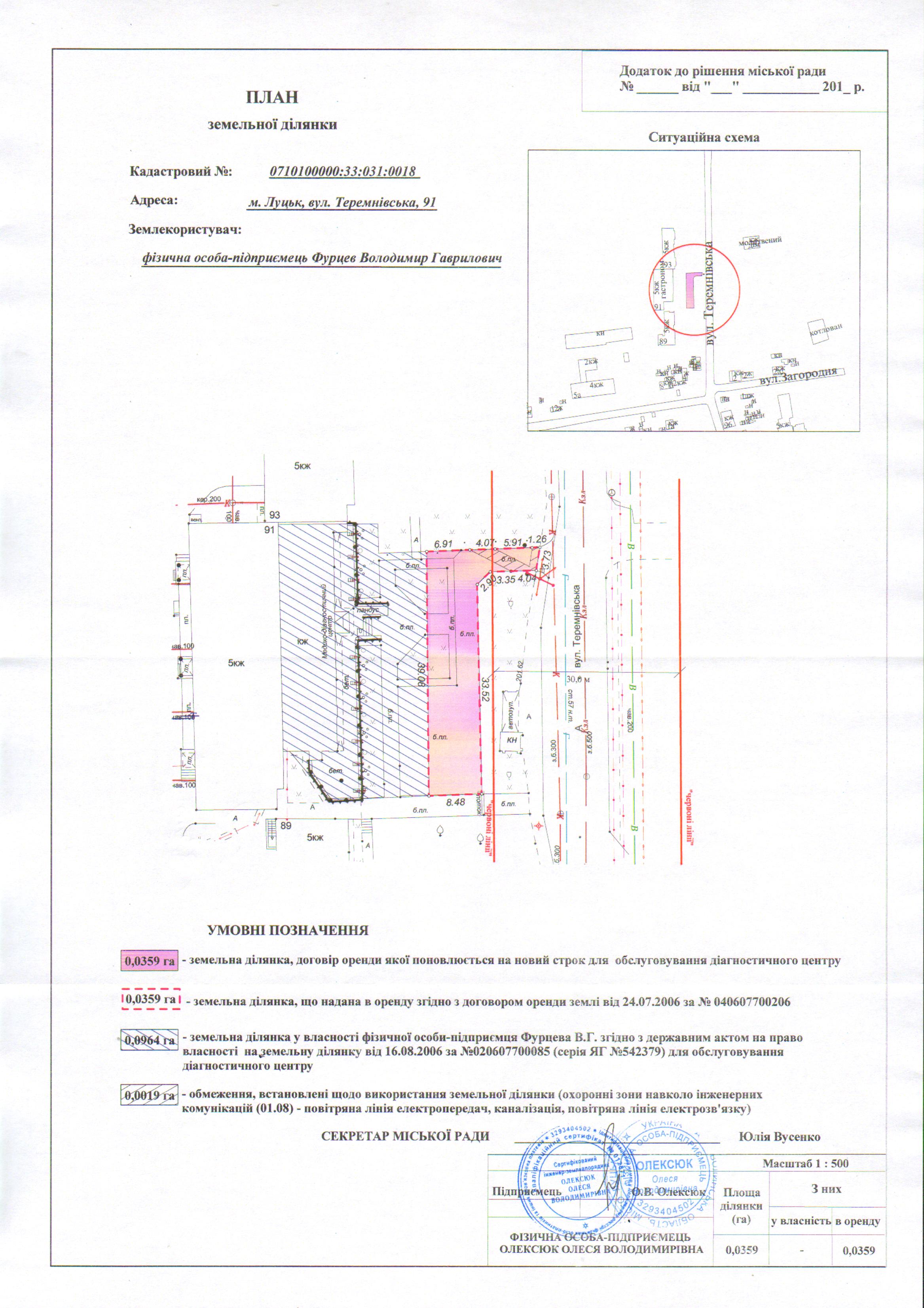 1. Продовжити фізичній особі-підприємцю Фурцеву Володимиру Гавриловичу термін оренди земельної ділянки на вул. Теремнівській, 91 строком на 10 років з дати закінчення договору оренди землі (до 24.07.2026), площею 0,0359 га, кадастровим номером 0710100000:33:031:0018, для обслуговування діагностичного центру, згідно з додатком.