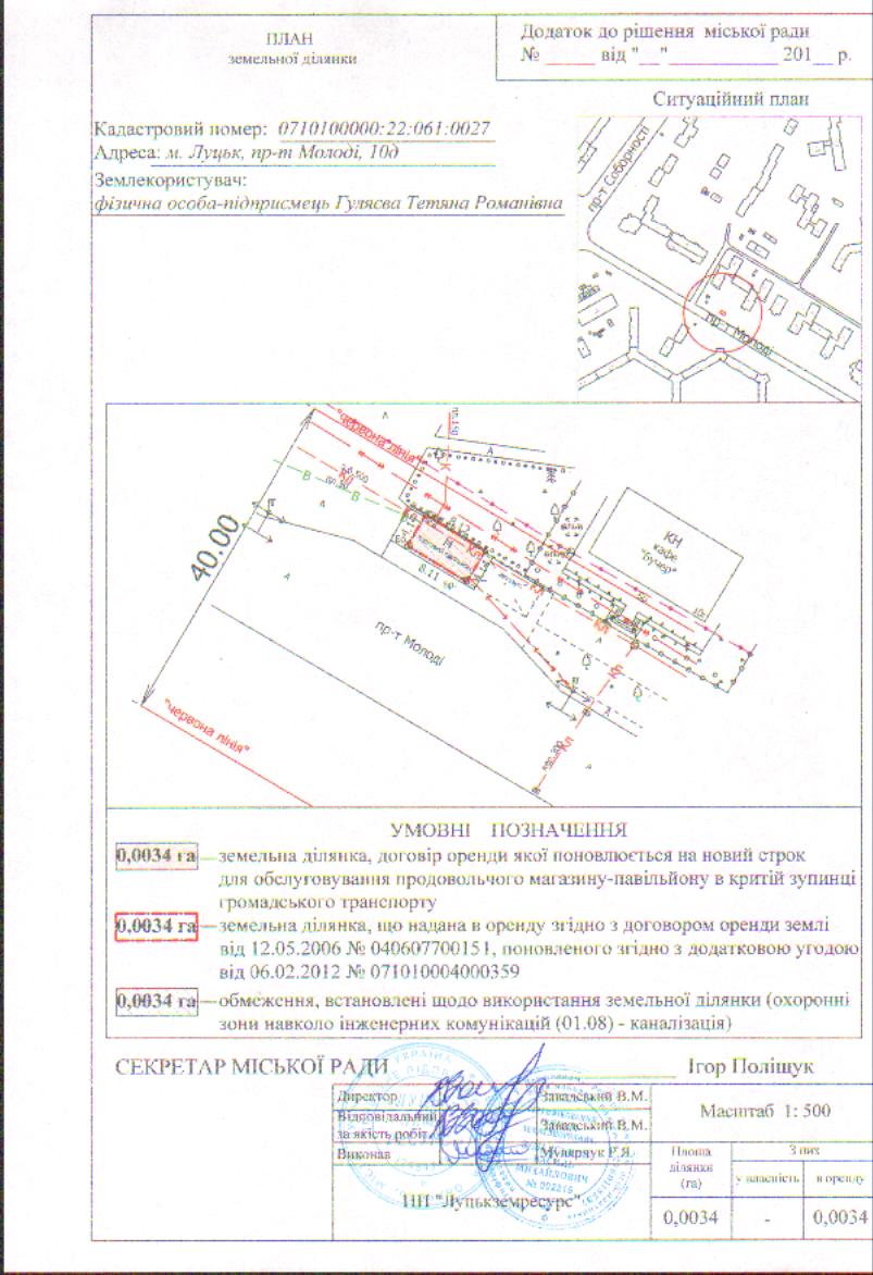1. Продовжити фізичній особі-підприємцю Гуляєвій Тетяні Романівні термін оренди земельної ділянки на пр-ті Молоді, 10д строком на 1 рік з дати закінчення договору оренди землі (до 06.02.2018), площею 0,0034 га, кадастровим номером 0710100000:22:061:0027, для обслуговування продовольчого магазину-павільйону в критій зупинці громадського транспорту, згідно з додатком.