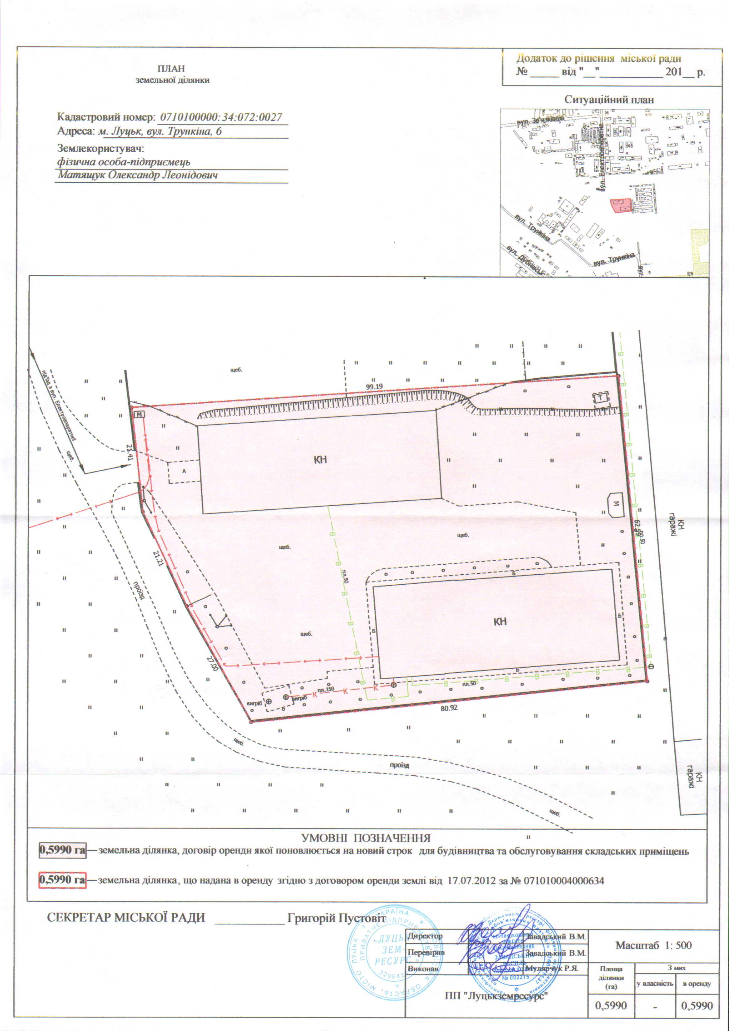 Розглянувши клопотання фізичної особи-підприємця Матящука Олександра Леонідовича щодо поновлення договору оренди землі, зареєстрованого у Державному реєстрі земель від 17.07.2012 за № 071010004000634, витяг з Державного земельного кадастру про земельну ділянку від 17.07.2017 № НВ-0703201922017, враховуючи правовстановлюючі документи фізичної особи-підприємця Матящука Олександра Леонідовича на об'єкти нерухомого майна на вул. Трункіна, 6: договір купівлі-продажу нерухомого майна від 19.07.2010 № 1442, відповідно до якого право власності на відкритий склад (А-1) зареєстровано 26.08.2010, реєстраційний номер: 19414812, технічний паспорт на об'єкт нерухомого майна від 23.06.2017; договір купівлі-продажу нерухомого майна від 19.07.2010 № 1442, відповідно до якого право власності на відкритий склад (Б-1) зареєстровано 26.08.2010, реєстраційний номер: 19414857, технічний паспорт на об'єкт нерухомого майна від 10.12.2010, лист Головного управління Держгеокадастру у Волинській області від 22.08.2017 № 31-3-0.2-6788/2-17, керуючись статтями 12, 93, 96 Земельного кодексу України, статтею 33 Закону України «Про оренду землі», статтею 4 Закону України «Про державну реєстрацію речових прав на нерухоме майно та їх обтяжень», Законом України «Про внесення змін до деяких законодавчих актів України щодо розмежування земель державної та комунальної власності», статтею 26 Закону України «Про місцеве самоврядування в Україні», пунктами 162, 171 Постанови Кабінету Міністрів України від 17.10.2012 № 1051 «Про затвердження Порядку ведення Державного земельного кадастру», пунктами 8, 30 договору оренди землі, міська рада