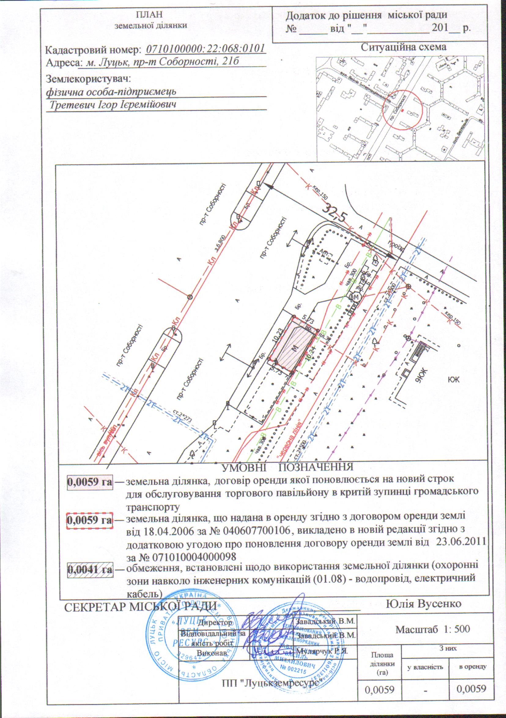1. Продовжити фізичній особі-підприємцю Третевичу Ігорю Ієремійовичу термін оренди земельної ділянки на пр-ті Соборності, 21б строком на 5 років з дати закінчення договору оренди землі (до 23.06.2021), площею 0,0059 га, кадастровим номером 0710100000:22:068:0101, для обслуговування торгового павільйону в критій зупинці громадського транспорту, згідно з додатком.