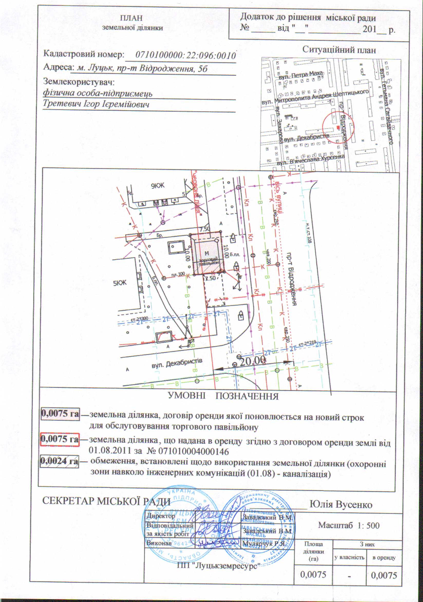 1. Продовжити фізичній особі-підприємцю Третевичу Ігорю Ієремійовичу термін оренди земельної ділянки на пр-ті Відродження, 5б строком на 5 років з дати закінчення договору оренди землі (до 01.08.2021), площею 0,0075 га, кадастровим номером 0710100000:22:096:0010, для обслуговування торгового павільйону, згідно з додатком.