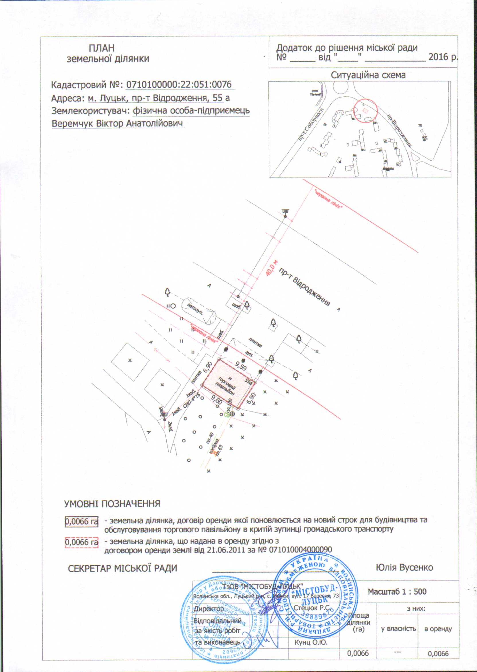 1. Продовжити фізичній особі-підприємцю Веремчуку Віктору Анатолійовичу термін оренди земельної ділянки на пр-ті Відродження, 55а строком на 5 років з дати закінчення договору оренди землі (до 21.06.2021), площею 0,0066 га, кадастровим номером 0710100000:22:051:0076, для будівництва та обслуговування торгового павільйону в критій зупинці громадського транспорту, згідно з додатком.