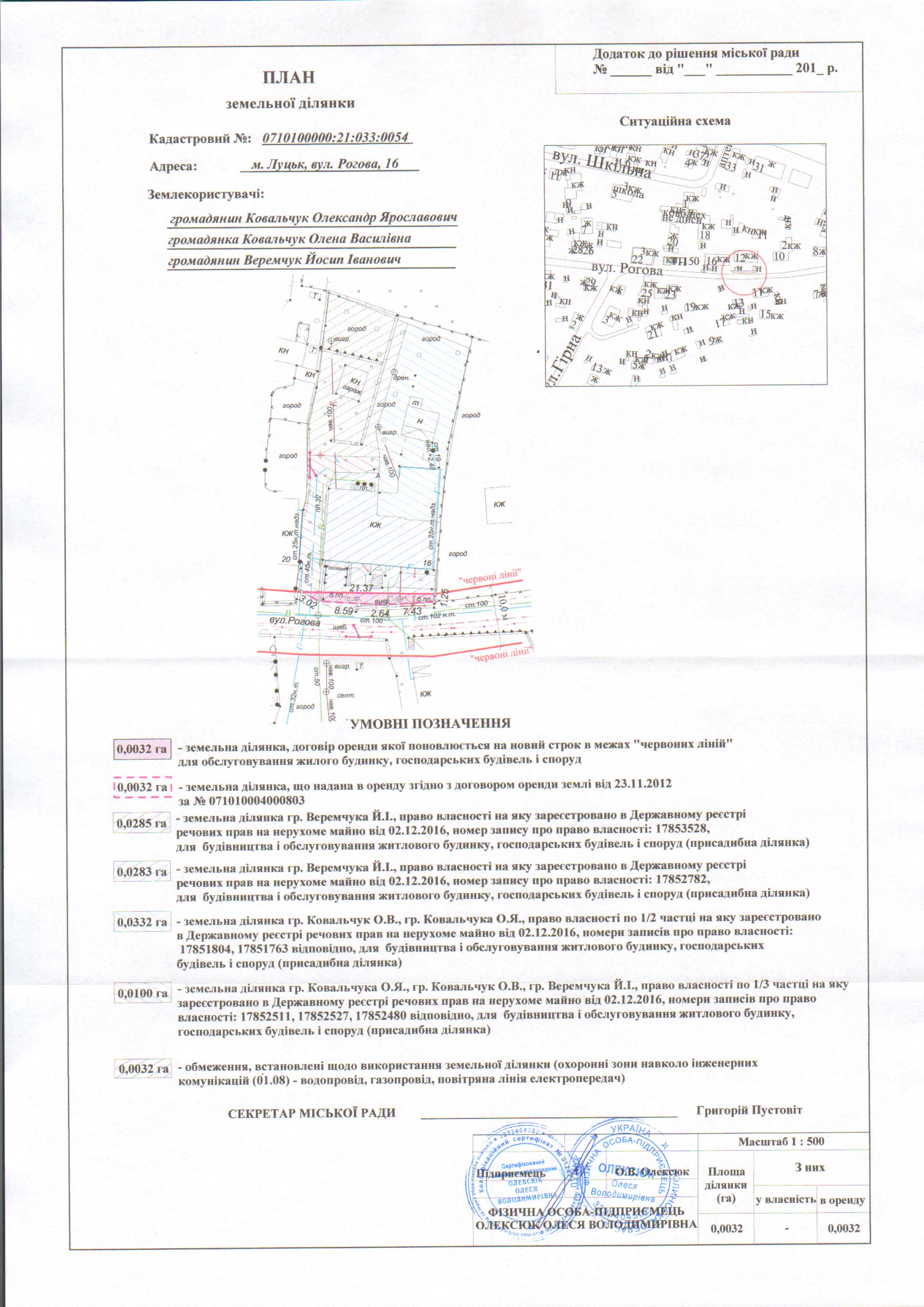 Розглянувши клопотання громадян Ковальчука Олександра Ярославовича, Ковальчук Олени Василівни, Веремчука Йосипа Івановича щодо поновлення договору оренди землі, зареєстрованого у Державному реєстрі земель від 23.11.2012 за № 071010004000803, враховуючи правовстановлюючі документи громадян Ковальчука Олександра Ярославовича, Ковальчук Олени Василівни, Веремчука Йосипа Івановича на об’єкти нерухомого майна на вул. Роговій, 16: договір про поділ житлового будинку, що є у спільній частковій власності від 18.01.2017 за № 3, відповідно до якого право власності: громадянина Веремчука Йосипа Івановича на квартиру № 1 в житловому будинку № 16 зареєстроване в Державному реєстрі речових прав на нерухоме майно від 07.02.2017, номер запису про право власності: 18980005, громадян Ковальчук Олени Василівни, Ковальчука Олександра Ярославовича по ½ частці на квартиру № 2 в житловому будинку № 16 зареєстроване в Державному реєстрі речових прав на нерухоме майно від 07.02.2017, номери записів про право власності: 18981848, 18981821 відповідно, технічний паспорт на квартиру № 1 у житловому будинку садибного типу № 16 від 28.12.2016, технічний паспорт на квартиру № 2 у житловому будинку садибного типу № 16 від 28.12.2016; інформаційну довідку з Державного реєстру речових прав на нерухоме майно від 25.10.2017 № 101529494, відповідно до якої право власності: громадянина Веремчука Йосипа Івановича на земельні ділянки площею 0,0285 га кадастровим номером 0710100000:21:033:0067 та площею 0,0283 га кадастровим номером 0710100000:21:033:0064 зареєстроване в Державному реєстрі речових прав на нерухоме майно від 02.12.2016, номери записів про право власності: 17853528, 17852782 відповідно; громадян Ковальчука Олександра Ярославовича, Ковальчук Олени Василівни, Веремчука Йосипа Івановича по 1/3 частці на земельну ділянку площею 0,0100 га кадастровим номером 0710100000:21:033:0065 зареєстроване в Державному реєстрі речових прав на нерухоме майно від 02.12.2016, номери записів про право власності: 17852511, 17852527, 17852480 відповідно; громадян Ковальчук Олени Василівни, Ковальчука Олександра Ярославовича по 1/2 частці на земельну ділянку площею 0,0332 га кадастровим номером 0710100000:21:033:0066 зареєстроване в Державному реєстрі речових прав на нерухоме майно від 02.12.2016, номери записів про право власності: 17851804, 17851763 відповідно, рішення Луцької міської ради від 29.11.2011 № 16/6 «Про перейменування вулиць міста Луцька», керуючись статтями 12, 93, 96 Земельного кодексу України, статтею 33 Закону України «Про оренду землі», Законом України «Про Державний земельний кадастр», статтею 4 Закону України «Про державну реєстрацію речових прав на нерухоме майно та їх обтяжень», Законом України «Про внесення змін до деяких законодавчих актів України щодо розмежування земель державної та комунальної власності», статтею 26 Закону України «Про місцеве самоврядування в Україні», пунктами 162, 171 Постанови Кабінету Міністрів України від 17.10.2012 № 1051 «Про затвердження Порядку ведення Державного земельного кадастру», пунктами 8, 30 договору оренди землі, міська рада