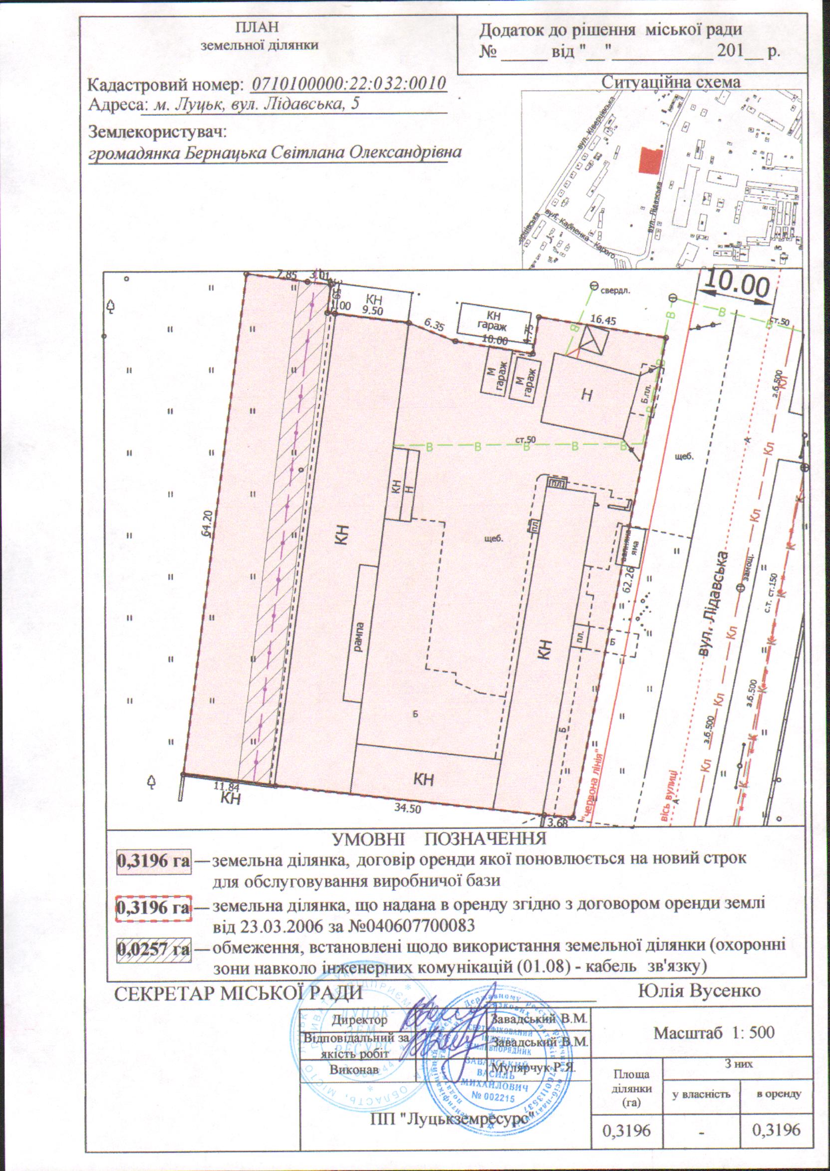 1. Продовжити громадянці Бернацькій Світлані Олександрівні термін оренди земельної ділянки на вул. Лідавській, 5 строком на 10 років, площею 0,3196 га, кадастровим номером 0710100000:22:032:0010, для обслуговування виробничої бази, згідно з додатком.