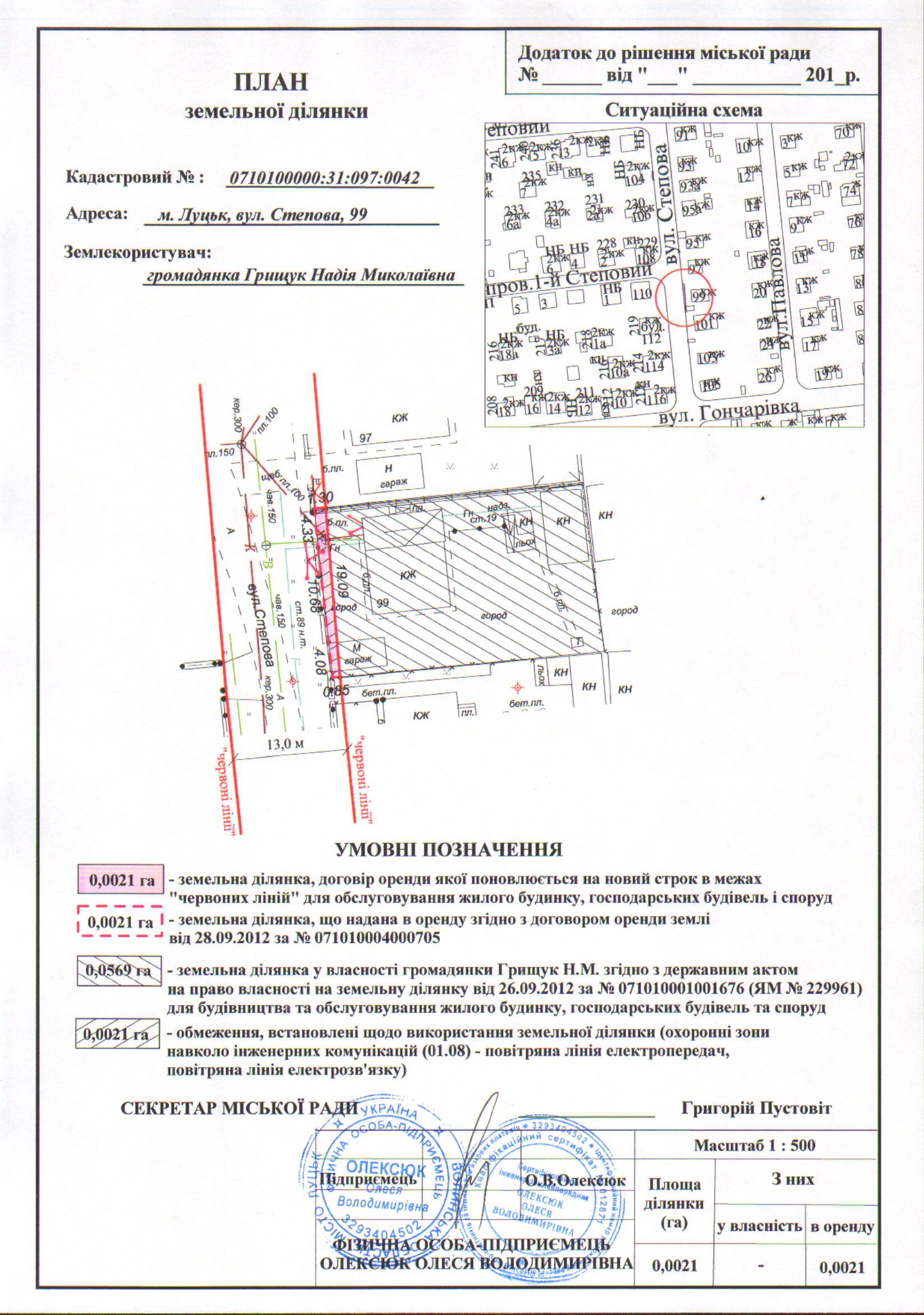 1. Продовжити громадянці Грищук Надії Миколаївні термін оренди земельної ділянки на вул. Степовій, 99 строком на 25 років з дати закінчення договору оренди землі (до 28.09.2042), площею 0,0021 га, кадастровим номером 0710100000:31:097:0042, в межах «червоних ліній» для обслуговування жилого будинку, господарських будівель і споруд, згідно з додатком.
