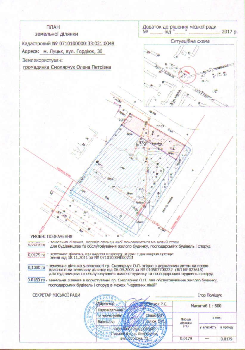 1. Продовжити громадянці Смолярчук Олені Петрівні термін оренди земельної ділянки на вул. Гордіюк, 30 строком на 25 років з дати закінчення договору оренди землі (до 18.11.2041), площею 0,0179 га, кадастровим номером 0710100000:33:021:0048, для будівництва та обслуговування жилого будинку, господарських будівель і споруд, згідно з додатком.