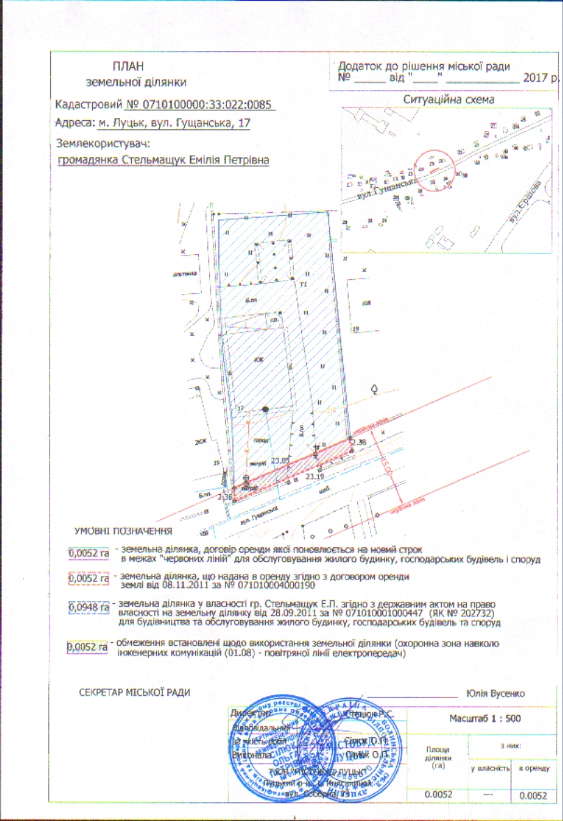 1. Продовжити громадянці Стельмащук Емілії Петрівні термін оренди земельної ділянки на вул. Гущанській, 17, строком на 25 років з дати закінчення договору оренди землі (до 08.11.2041), площею 0,0052 га, кадастровим номером 0710100000:33:022:0085, в межах «червоних ліній» для обслуговування жилого будинку, господарських будівель і споруд, згідно з додатком.