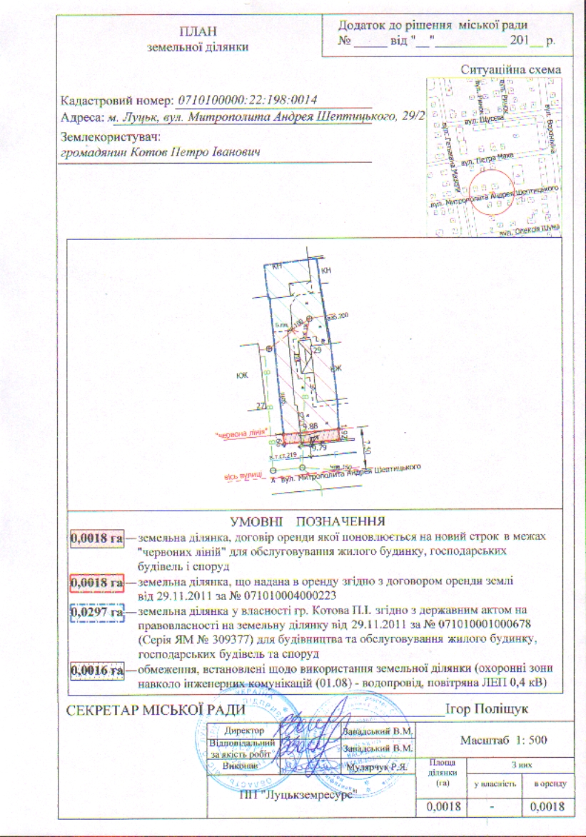 Розглянувши клопотання громадянина Котова Петра Івановича щодо поновлення договору оренди землі, зареєстрованого у Державному реєстрі земель від 29.11.2011 за № 071010004000223, витяг з Державного земельного кадастру про земельну ділянку від 09.03.2017 № НВ-0702828912017, враховуючи правовстановлюючі документи громадянина Котова Петра Івановича на об’єкти нерухомого майна на вул. Митрополита Андрея Шептицького, 29/2 (вул. Орджонікідзе, 21/2): договір купівлі-продажу квартири від 18.08.1992 за № 5-2635, відповідно до якого право власності на квартиру № 2 зареєстроване 17.09.1992 за № 7023, технічний паспорт на квартиру № 2 в житловому будинку № 29 від 02.09.1992, реєстровий № 7023, державний акт на право власності на земельну ділянку площею 0,0297 га, зареєстрований в Книзі записів реєстрації державних актів на право власності на землю та на право постійного користування землею, договорів оренди землі від 29.11.2011 за № 071010001000678, рішення Луцької міської ради від 30.11.2011 № 16/6 «Про перейменування вулиць міста Луцька», рішення виконавчого комітету Луцької міської ради від 15.05.2013 «Про зміну нумерації будівель у зв’язку з перейменуванням вулиць», керуючись статтями 12, 93, 96, 124-126 Земельного кодексу України, статтею 33 Закону України «Про оренду землі», Законом України «Про державну реєстрацію речових прав на нерухоме майно та їх обтяжень», Законом України «Про Державний земельний кадастр», Законом України «Про внесення змін до деяких законодавчих актів України щодо розмежування земель державної та комунальної власності», статтею 26 Закону України «Про місцеве самоврядування в Україні», Постановою Кабінету Міністрів України від 17.10.2012 № 1051 «Про затвердження Порядку ведення Державного земельного кадастру», пунктами 8, 29 договору оренди землі, міська рада