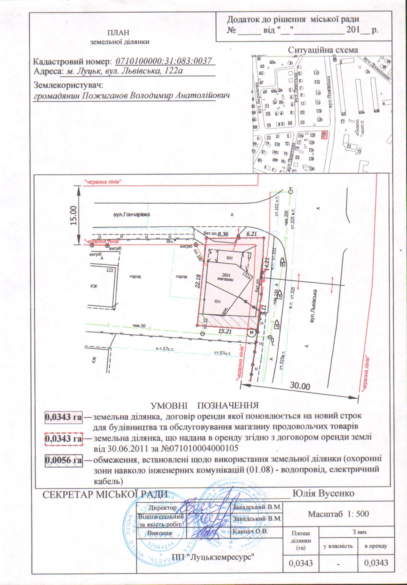 1. Продовжити громадянину Пожиганову Володимиру Анатолійовичу термін оренди земельної ділянки на вул. Львівській, 122а строком на 5 років з дати закінчення договору оренди землі (до 30.06.2021 року), площею 0,0343 га, кадастровим номером 0710100000:31:083:0037, для будівництва та обслуговування магазину продовольчих товарів, згідно з додатком.