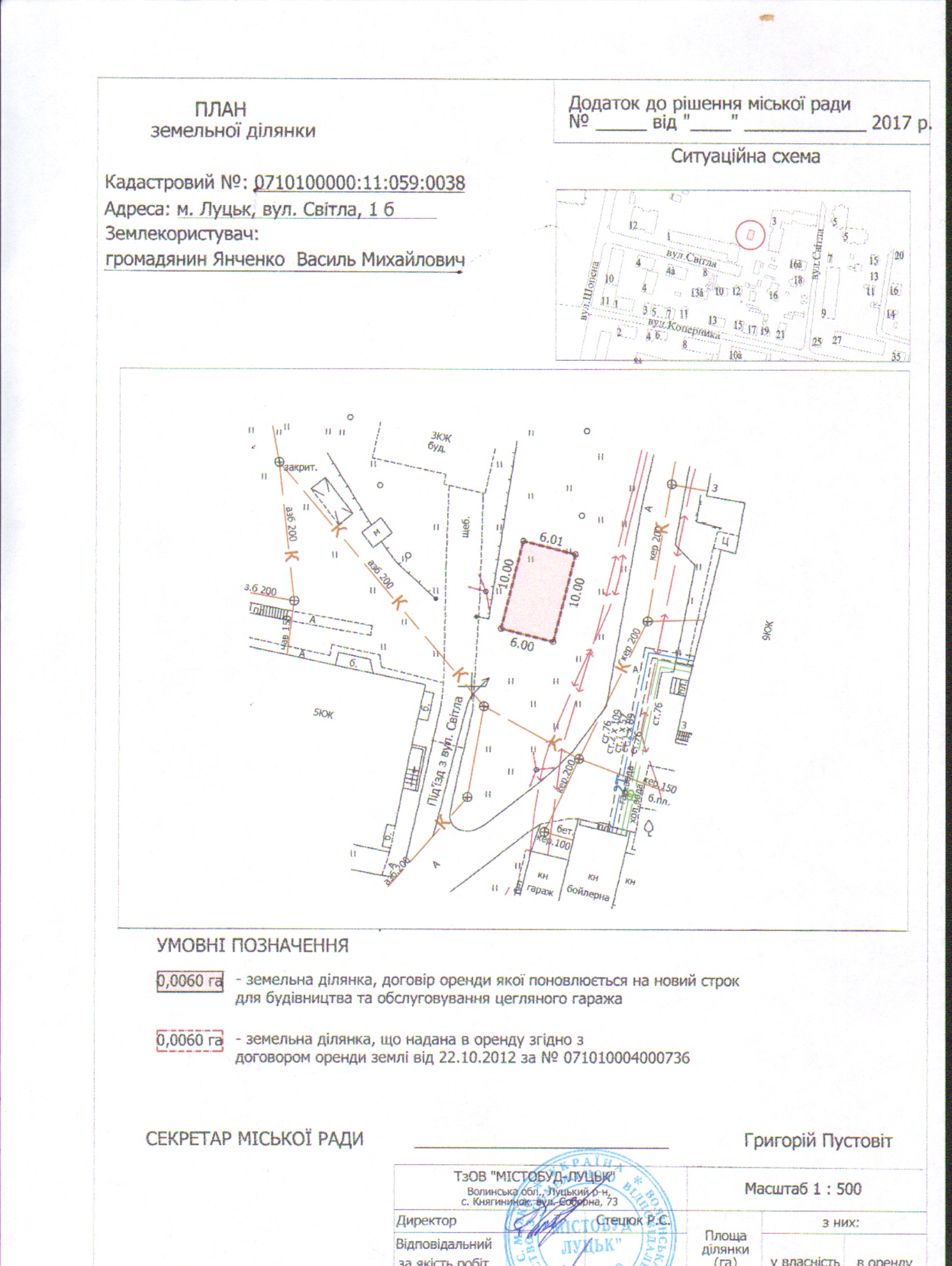 1. Продовжити громадянину Янченку Василю Михайловичу термін оренди земельної ділянки на вул. Світлій, 1б, строком на 5 років з дати закінчення договору оренди землі (до 22.10.2022), площею 0,0060 га, кадастровим номером 0710100000:11:059:0038, для будівництва та обслуговування цегляного гаража, згідно з додатком.