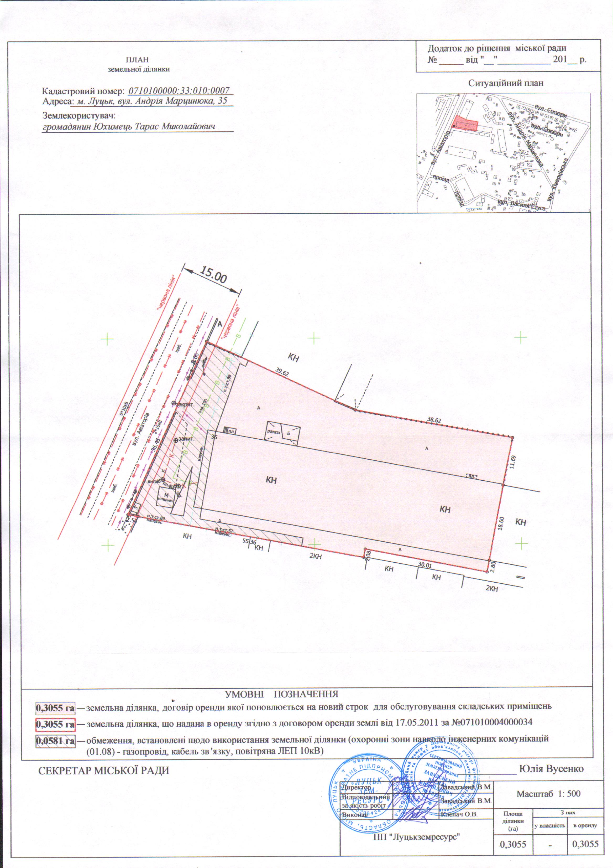 1. Продовжити громадянину Юхимцю Тарасу Миколайовичу термін оренди земельної ділянки на вул. Андрія Марцинюка, 35 строком на 10 років з дати закінчення договору оренди землі (до 17.05.2026 року), площею 0,3055 га, кадастровим номером 0710100000:33:010:0007, для обслуговування складських приміщень, згідно з додатком.