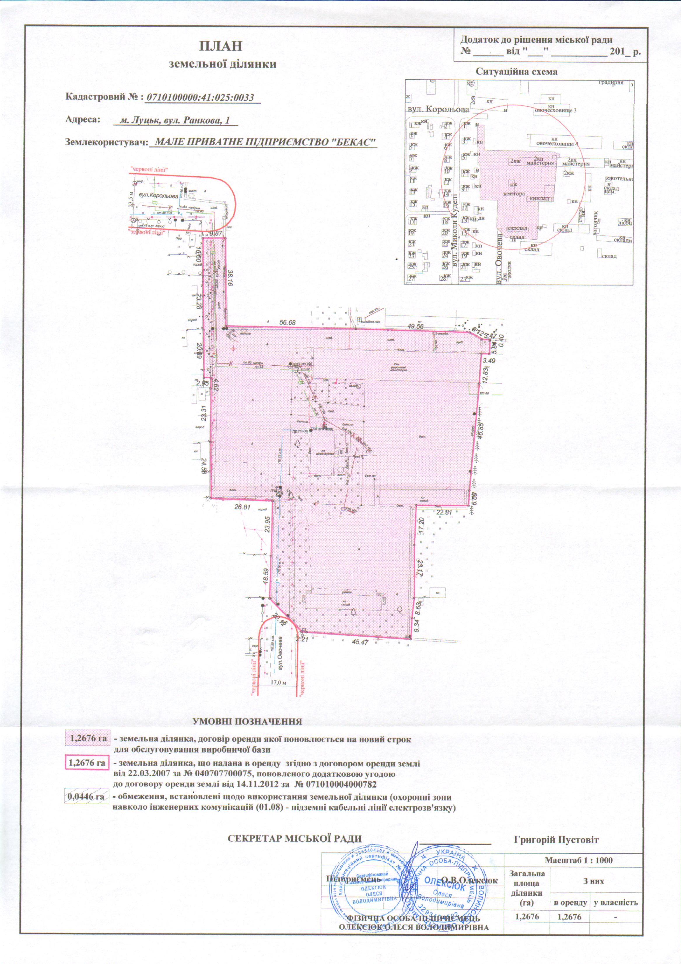 Розглянувши клопотання МАЛОГО ПРИВАТНОГО ПІДПРИЄМСТВА «БЕКАС» щодо поновлення договору оренди землі, зареєстрованого в книзі записів державної реєстрації договорів оренди землі 22.03.2007 за № 040707700075, поновленого додатковою угодою про поновлення договору оренди землі, зареєстрованою у Державному реєстрі земель від 14.11.2012 за № 071010004000782, витяг з Державного земельного кадастру про земельну ділянку від 18.10.2017 № НВ-0703454432017, враховуючи правовстановлюючі документи МАЛОГО ПРИВАТНОГО ПІДПРИЄМСТВА «БЕКАС» на об'єкти нерухомого майна на вул. Ранковій, 1: витяг з Державного реєстру речових прав на нерухоме майно про реєстрацію права власності від 17.11.2014, індексний номер витягу: 29578283, відповідно до якого право власності на реммайстерню зареєстроване у Державному реєстрі речових прав на нерухоме майно 17.11.2014, номер запису про право власності: 7713244, технічний паспорт на об’єкт нерухомого майна від 14.02.2007; витяг з Державного реєстру речових прав на нерухоме майно про реєстрацію права власності від 17.11.2014, індексний номер витягу: 29569946, відповідно до якого право власності на будівлю складу зареєстроване у Державному реєстрі речових прав на нерухоме майно 17.11.2014, номер запису про право власності: 7711073, технічний паспорт на об’єкт нерухомого майна від 05.12.2005; витяг з Державного реєстру речових прав на нерухоме майно про реєстрацію права власності від 18.06.2013, індексний номер витягу: 5032514, відповідно до якого право власності на будівлю контори зареєстроване у Державному реєстрі речових прав на нерухоме майно 18.06.2013, номер запису про право власності: 1345039, технічний паспорт на об’єкт нерухомого майна від 08.12.2005; витяг з Державного реєстру речових прав на нерухоме майно про реєстрацію права власності від 17.11.2014, індексний номер витягу: 29561963, відповідно до якого право власності на гаражно-складське приміщення зареєстроване у Державному реєстрі речових прав на нерухоме майно 17.11.2014, номер запису про право власності: 7709204, технічний паспорт на об’єкт нерухомого майна від 05.09.2005; технічний паспорт на об’єкт нерухомого майна від 30.10.2017, керуючись статтями 12, 93, 96 Земельного кодексу України, статтею 33 Закону України «Про оренду землі», статтею 4 Закону України «Про державну реєстрацію речових прав на нерухоме майно та їх обтяжень», Законом України «Про внесення змін до деяких законодавчих актів України щодо розмежування земель державної та комунальної власності», статтею 26 Закону України «Про місцеве самоврядування в Україні», пунктами 162, 171 Постанови Кабінету Міністрів України від 17.10.2012 № 1051 «Про затвердження Порядку ведення Державного земельного кадастру», пунктами 8, 30 договору оренди землі, міська рада