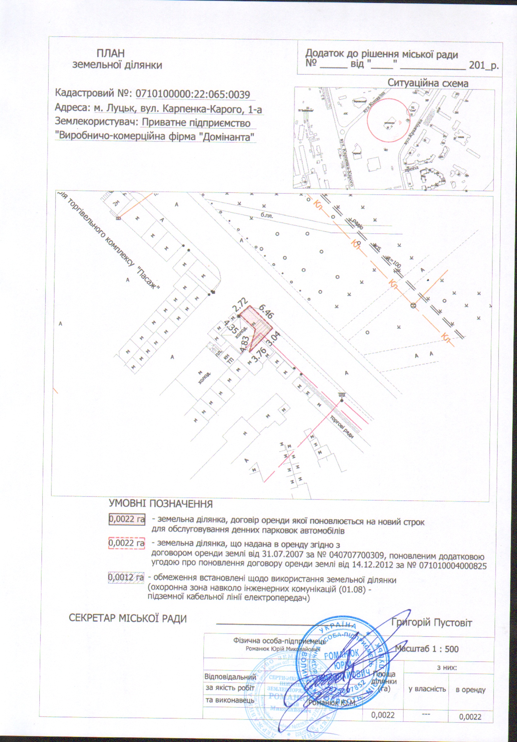 1. Продовжити Приватному підприємству «Виробничо-комерційна фірма «Домінанта» термін оренди земельної ділянки на вул. Карпенка-Карого, 1-а строком на 1 рік з дати закінчення договору оренди землі (до 14.12.2018), площею 0,0022 га, кадастровим номером 0710100000:22:065:0039, для обслуговування денних парковок автомобілів, згідно з додатком.
