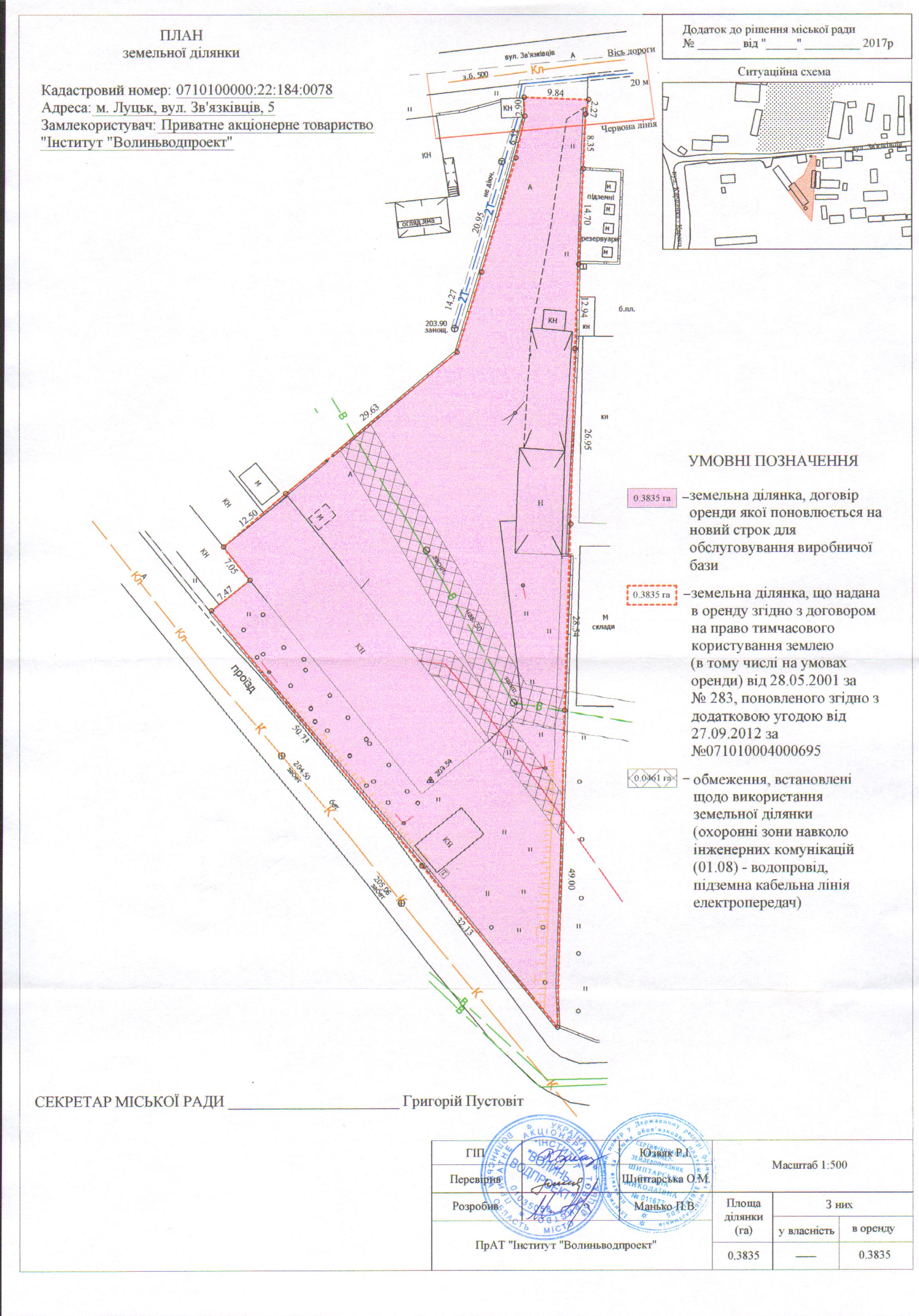 Розглянувши клопотання Приватного акціонерного товариства «Інститут «Волиньводпроект» щодо поновлення договору оренди землі, зареєстрованого в книзі реєстрації договорів на право тимчасового користування землею (в тому числі на умовах оренди) 28.05.2001 за № 283, поновленого додатковою угодою до договору оренди землі, зареєстрованою у Державному реєстрі земель від 27.09.2012 за № 071010004000695, витяг з Державного земельного кадастру про земельну ділянку від 22.08.2017 № НВ-0703309182017, враховуючи правовстановлюючі документи Приватного акціонерного товариства «Інститут «Волиньводпроект» на об'єкти нерухомого майна на вул. Зв’язківців, 5: свідоцтво про право власності від 07.06.2011, відповідно до якого право власності на 59/100 частин споруди автогаражів (приміщення з № 1 по № 14б загальною площею 499,5 кв.м.) зареєстровано 07.07.2011, реєстраційний номер: 1018309, технічний паспорт на об'єкт нерухомого майна від 05.05.2011; свідоцтво про право власності від 07.06.2011, відповідно до якого право власності на будівлю керносховища і насосної станції зареєстровано 07.07.2011, реєстраційний номер: 34080527, технічний паспорт на об'єкт нерухомого майна від 05.05.2011; свідоцтво про право власності від 07.06.2011, відповідно до якого право власності на будівлю електропідстанції зареєстровано 07.07.2011, реєстраційний номер: 34080609, технічний паспорт на об'єкт нерухомого майна від 05.05.2011, керуючись статтями 12, 93, 96 Земельного кодексу України, статтею 33 Закону України «Про оренду землі», статтею 4 Закону України «Про державну реєстрацію речових прав на нерухоме майно та їх обтяжень», Законом України «Про внесення змін до деяких законодавчих актів України щодо розмежування земель державної та комунальної власності», статтею 26 Закону України «Про місцеве самоврядування в Україні», пунктами 162, 171 Постанови Кабінету Міністрів України від 17.10.2012 № 1051 «Про затвердження Порядку ведення Державного земельного кадастру», пунктами 8, 30 договору оренди землі, міська рада