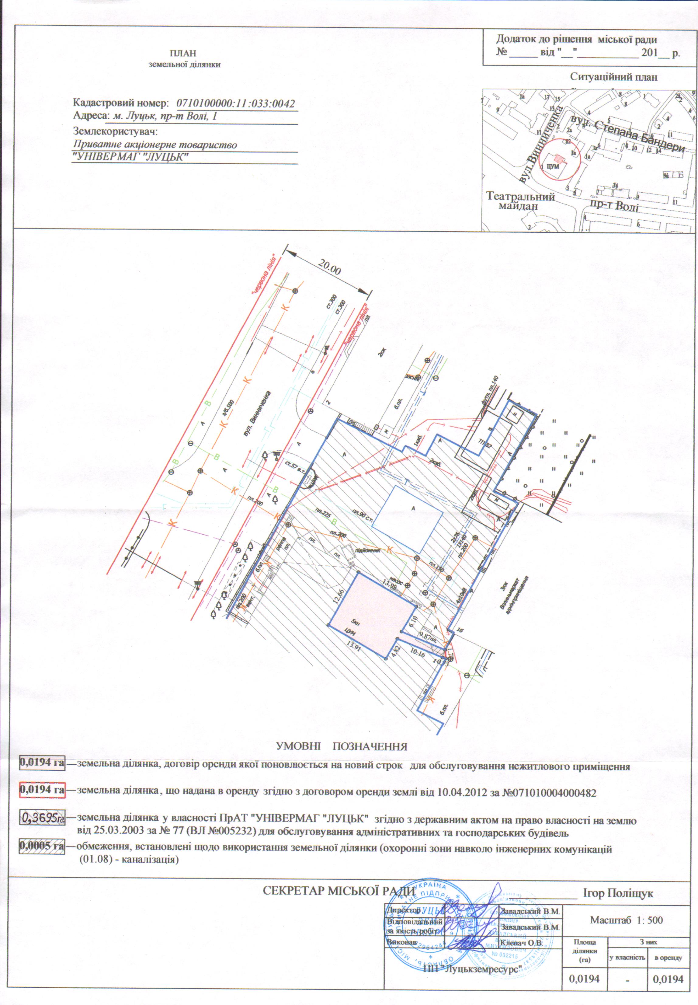 Розглянувши клопотання Приватного акціонерного товариства «УНІВЕРМАГ «ЛУЦЬК» щодо поновлення договору оренди землі, зареєстрованого у Державному реєстрі земель від 10.04.2012 за № 071010004000482, витяг з Державного земельного кадастру про земельну ділянку від 26.05.2017 № НВ-0703043312017, враховуючи правовстановлюючі документи Приватного акціонерного товариства «УНІВЕРМАГ «ЛУЦЬК» на об'єкти нерухомого майна: свідоцтво про право власності від 24.10.2012, відповідно до якого право власності на будівлю універмагу зареєстроване 19.12.2012, реєстраційний номер майна 38067052, технічний паспорт на об’єкт нерухомого майна від 09.10.2012; державний акт на право власності на земельну ділянку площею 0,3695 га, зареєстрований в книзі записів державної реєстрації державних актів на право власності на землю за № 77 від 25.03.2003 (серія ВЛ № 005232), керуючись статтями 12, 93, 96 Земельного кодексу України, статтею 33 Закону України «Про оренду землі», Законом України «Про Державний земельний кадастр», Законом України «Про державну реєстрацію речових прав на нерухоме майно та їх обтяжень», Законом України «Про внесення змін до деяких законодавчих актів України щодо розмежування земель державної та комунальної власності», статтею 26 Закону України «Про місцеве самоврядування в Україні», пунктами 162, 171 Постанови Кабінету Міністрів України від 17.10.2012 № 1051 «Про затвердження Порядку ведення Державного земельного кадастру», пунктами 8, 30 договору оренди землі, міська рада