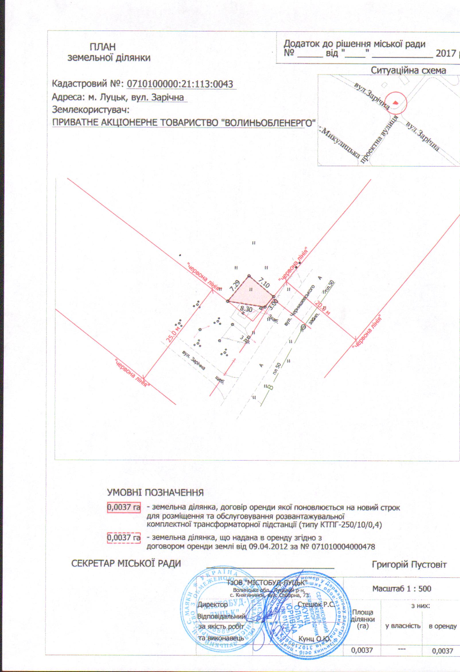 1. Продовжити ПРИВАТНОМУ АКЦІОНЕРНОМУ ТОВАРИСТВУ «ВОЛИНЬОБЛЕНЕРГО» термін оренди земельної ділянки на вул. Зарічній строком на 49 років з дати закінчення договору оренди землі (до 09.04.2066), площею 0,0037 га, кадастровим номером 0710100000:21:113:0043, для розміщення та обслуговування розвантажувальної комплектної трансформаторної підстанції (типу КТПГ-250/10/0,4), згідно з додатком.